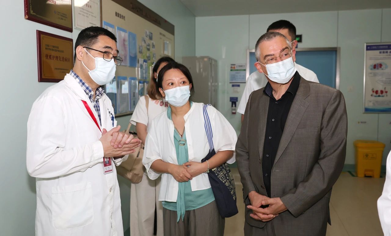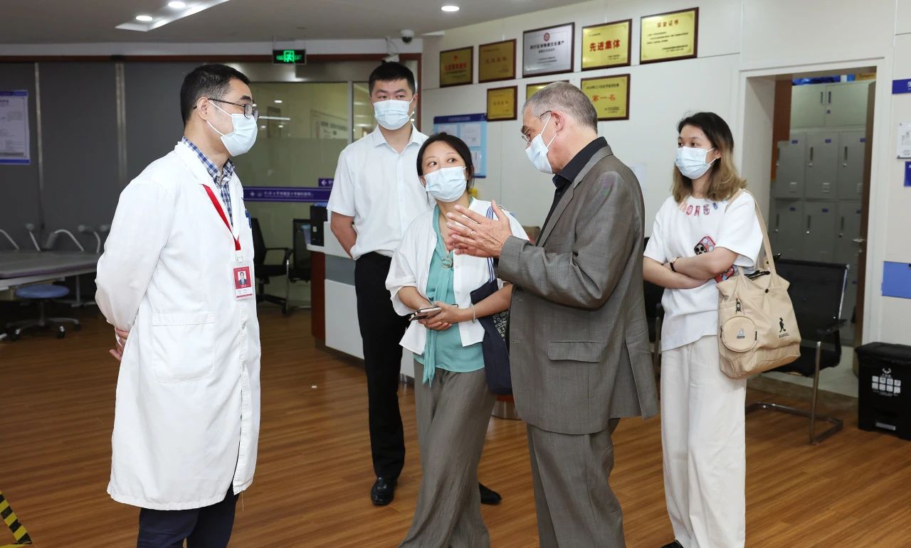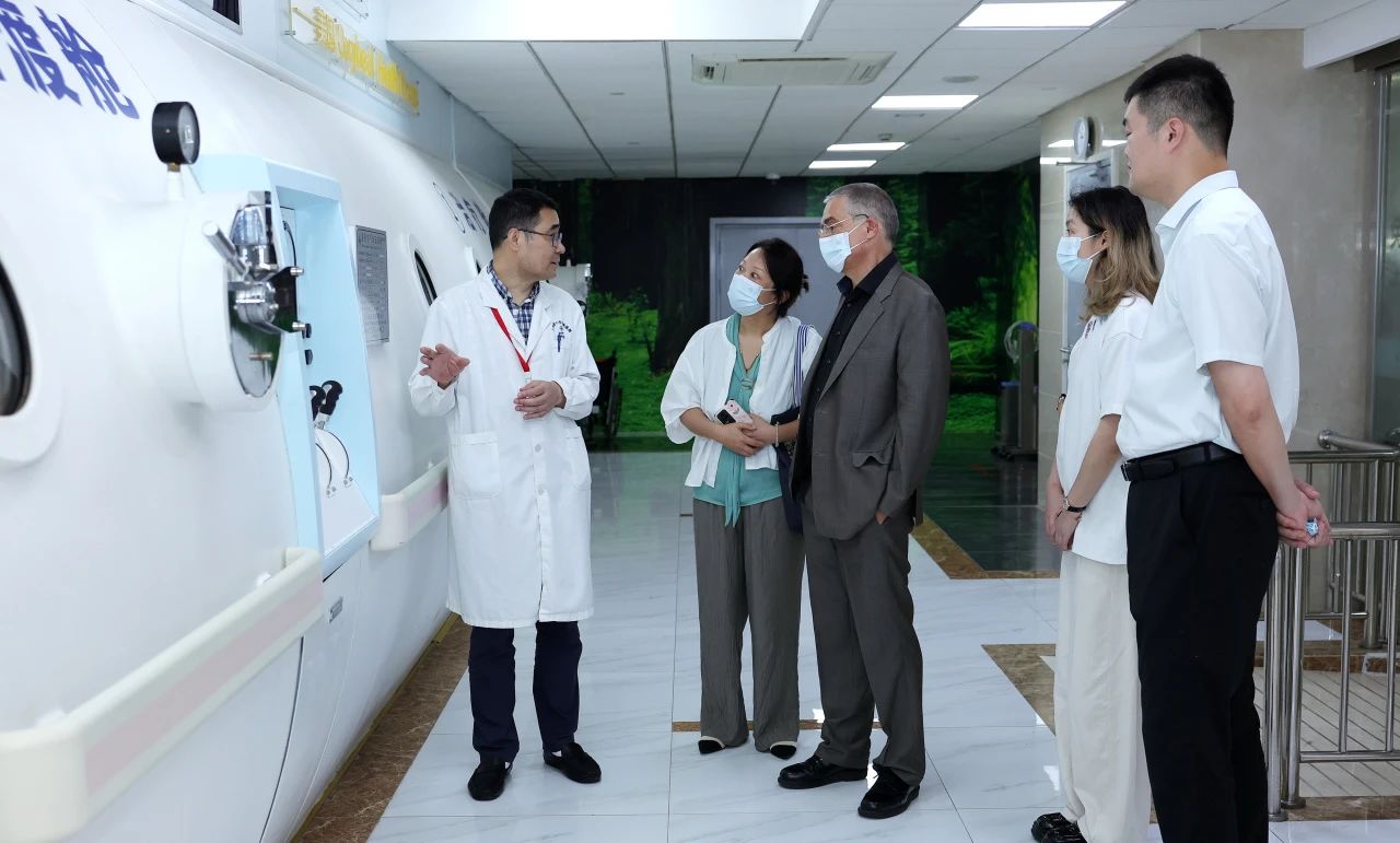 Andreas Heinz教授一行在潘耀良副院長的陪同下,深入醫院手術室、9F重癥醫學科、8A神經內六科、7A神經內三科、6B神經外二科、康復醫學科、放療科、醫學影像科、高壓氧科等科室參觀。