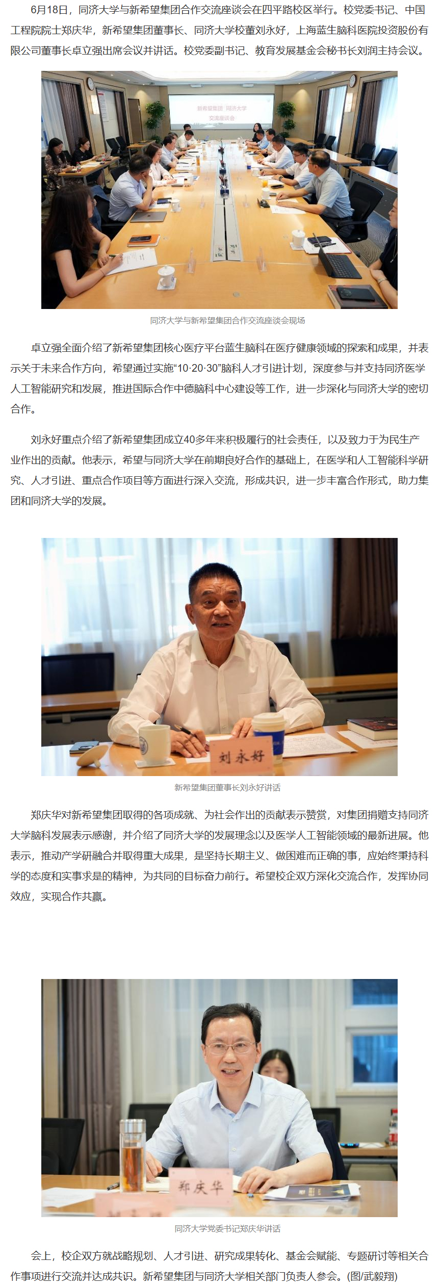 6月18日,同濟(jì)大學(xué)與新希望集團(tuán)合作交流座談會(huì)在四平路校區(qū)舉行。校黨委書記、中國工程院院士鄭慶華,新希望集團(tuán)董事長、同濟(jì)大學(xué)校董劉永好,上海藍(lán)生腦科醫(yī)院投資股份有限公司董事長卓立強(qiáng)出席會(huì)議并講話。校黨委副書記、教育發(fā)展基金會(huì)秘書長劉潤主持會(huì)議。