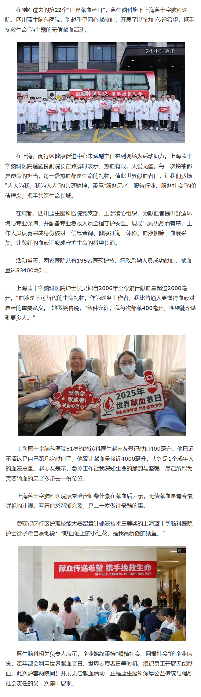 在剛剛過去的第22個“世界獻(xiàn)血者日”,藍(lán)生腦科旗下上海藍(lán)十字腦科醫(yī)院、四川藍(lán)生腦科醫(yī)院,跨越千里同心獻(xiàn)熱血,開展了以“獻(xiàn)血傳遞希望,攜手挽救生命”為主題的無償獻(xiàn)血活動。