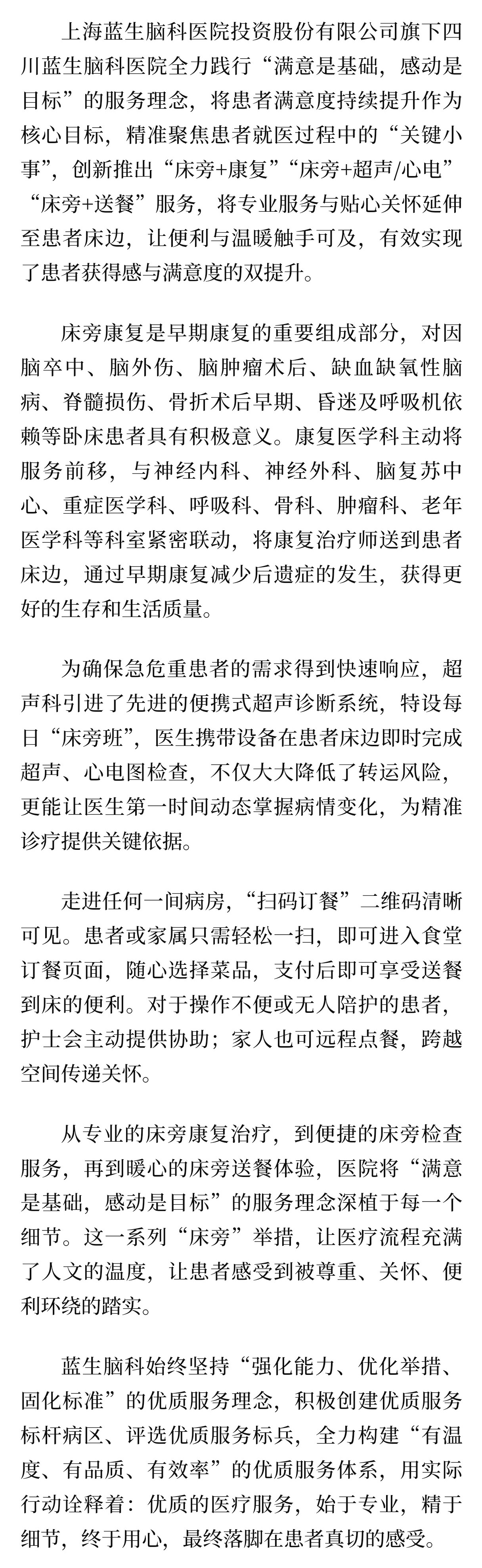 上海藍(lán)生腦科醫(yī)院投資股份有限公司旗下四川藍(lán)生腦科醫(yī)院全力踐行“滿(mǎn)意是基礎(chǔ),感動(dòng)是目標(biāo)”的服務(wù)理念,將患者滿(mǎn)意度持續(xù)提升作為核心目標(biāo),精準(zhǔn)聚焦患者就醫(yī)過(guò)程中的“關(guān)鍵小事”,創(chuàng)新推出“床旁+康復(fù)”“床旁+超聲/心電”“床旁+送餐”服務(wù),將專(zhuān)業(yè)服務(wù)與貼心關(guān)懷延伸至患者床邊,讓便利與溫暖觸手可及,有效實(shí)現(xiàn)了患者獲得感與滿(mǎn)意度的雙提升。
