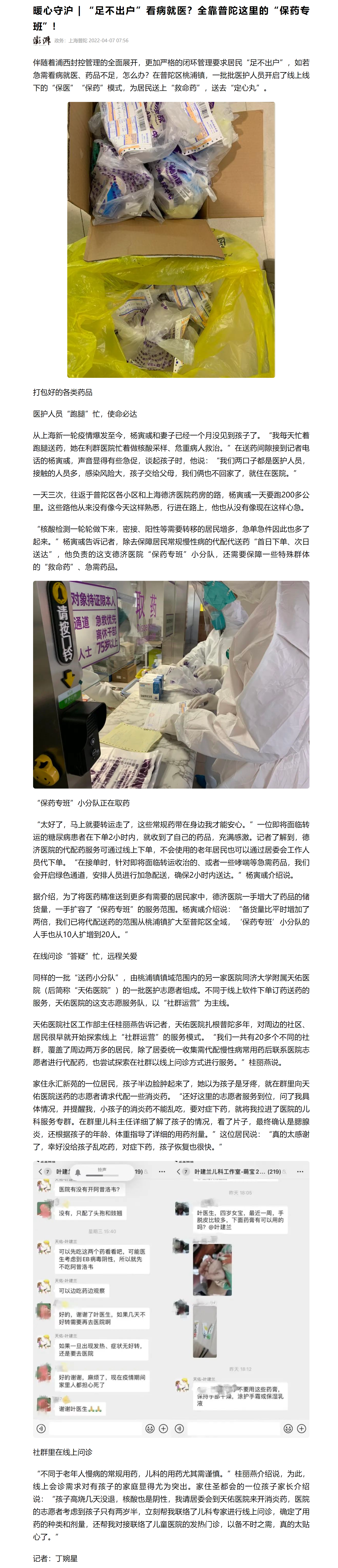 同樣的一批“送藥小分隊”,由桃浦鎮鎮域范圍內的另一家醫院同濟大學附屬天佑醫院(后簡稱“天佑醫院”)的一批醫護志愿者組成。不同于線上軟件下單訂藥送藥的服務,天佑醫院的這支志愿服務隊,以“社群運營”為主線。
