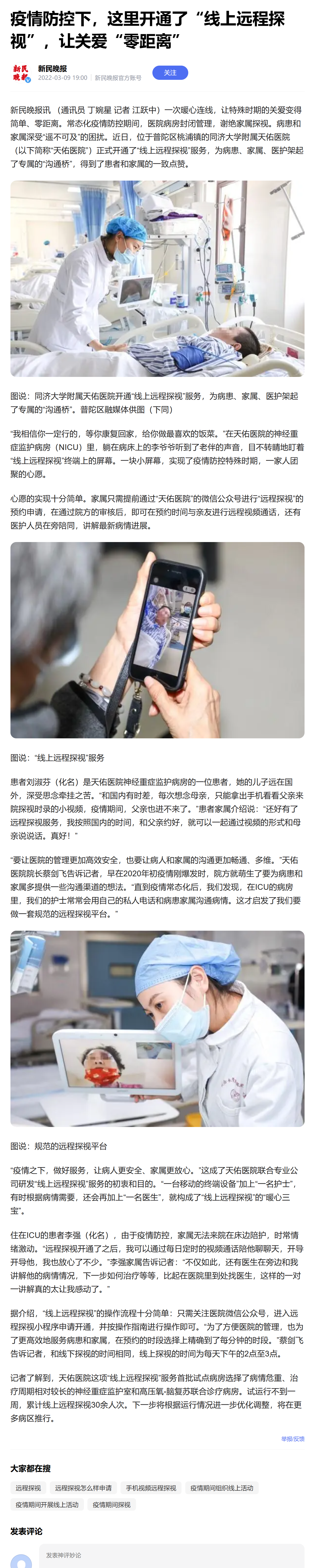 “我相信你一定行的,等你康復回家,給你做最喜歡的飯菜。”在天佑醫院的神經重癥監護病房(NICU)里,躺在病床上的李爺爺聽到了老伴的聲音,目不轉睛地盯著“線上遠程探視”終端上的屏幕。一塊小屏幕,實現了疫情防控特殊時期,一家人團聚的心愿。