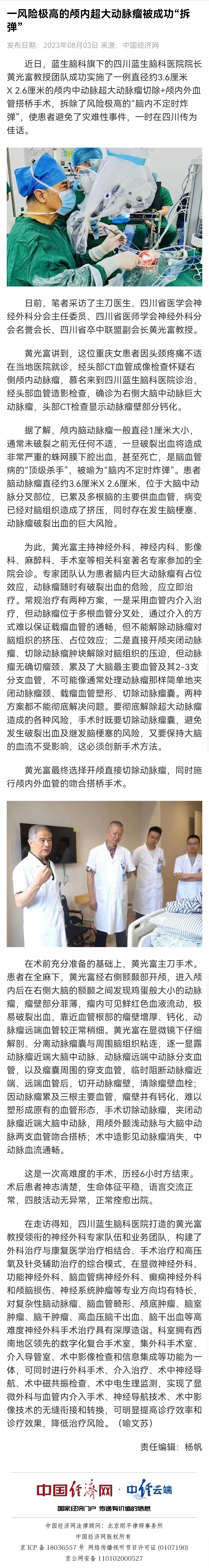 近日,藍生腦科旗下的四川藍生腦科醫院院長黃光富教授團隊成功實施了一例直徑約3.6厘米X 2.6厘米的顱內中動脈超大動脈瘤切除+顱內外血管搭橋手術,拆除了風險極高的“腦內不定時炸彈”,使患者避免了災難性事件,一時在四川傳為佳話。