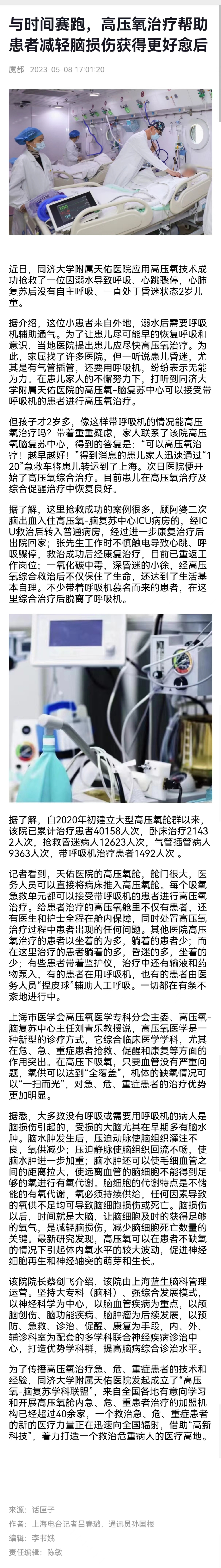 近日,同濟大學附屬天佑醫院應用高壓氧技術成功搶救了一位因溺水導致呼吸、心跳驟停,心肺復蘇后沒有自主呼吸、一直處于昏迷狀態2歲兒童。