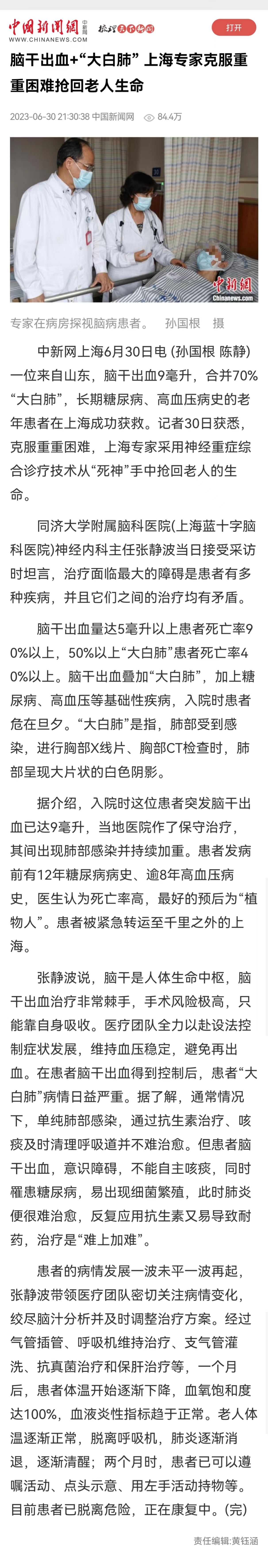 中新網(wǎng)上海6月30日電 (孫國根 陳靜)一位來自山東,腦干出血9毫升,合并70%“大白肺”,長期糖尿病、高血壓病史的老年患者在上海成功獲救。記者30日獲悉,克服重重困難,上海專家采用神經(jīng)重癥綜合診療技術(shù)從“死神”手中搶回老人的生命。