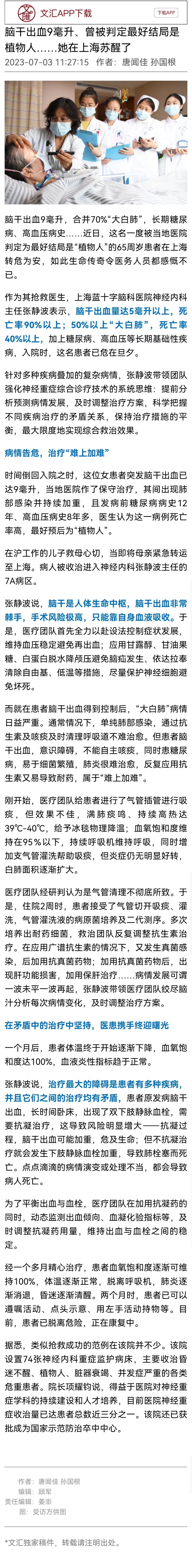 文匯報:腦干出血9毫升、曾被判定最好結局是植物人……她在上海蘇醒了