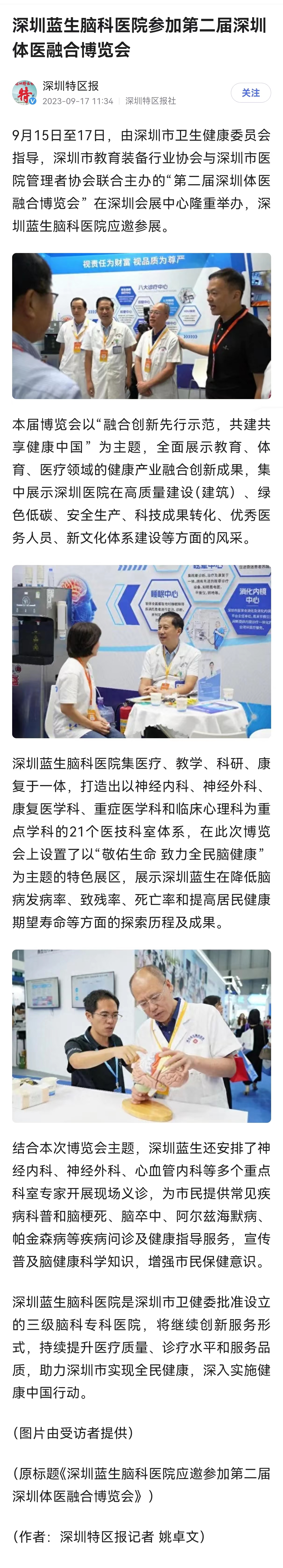 9月15日至17日,由深圳市衛(wèi)生健康委員會指導(dǎo),深圳市教育裝備行業(yè)協(xié)會與深圳市醫(yī)院管理者協(xié)會聯(lián)合主辦的“第二屆深圳體醫(yī)融合博覽會”在深圳會展中心隆重舉辦,深圳藍生腦科醫(yī)院應(yīng)邀參展。