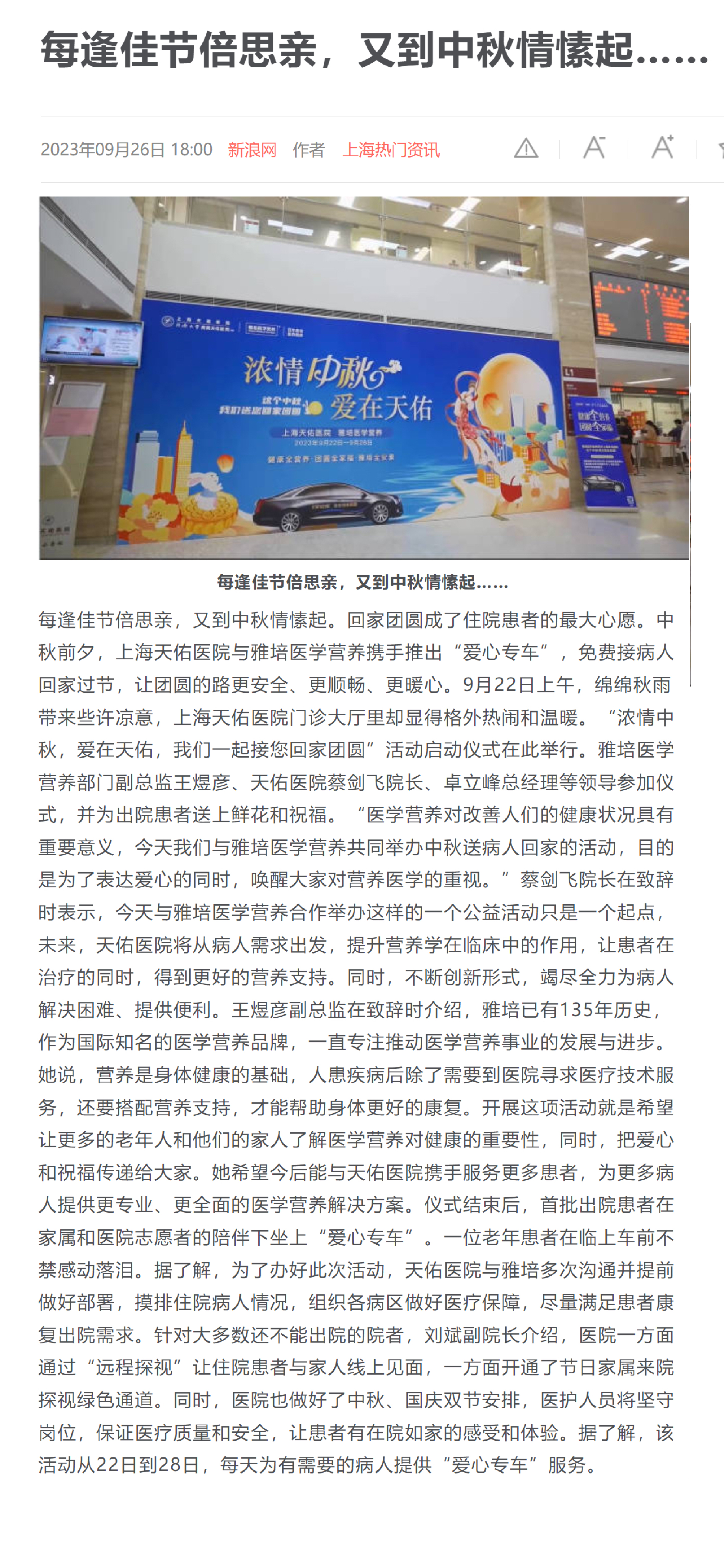 每逢佳節倍思親,又到中秋情愫起。回家團圓成了住院患者的最大心愿。中秋前夕,上海天佑醫院與雅培醫學營養攜手推出“愛心專車”,免費接病人回家過節,讓團圓的路更安全、更順暢、更暖心。9月22日上午,綿綿秋雨帶來些許涼意,上海天佑醫院門診大廳里卻顯得格外熱鬧和溫暖。“濃情中秋,愛在天佑,我們一起接您回家團圓”活動啟動儀式在此舉行。