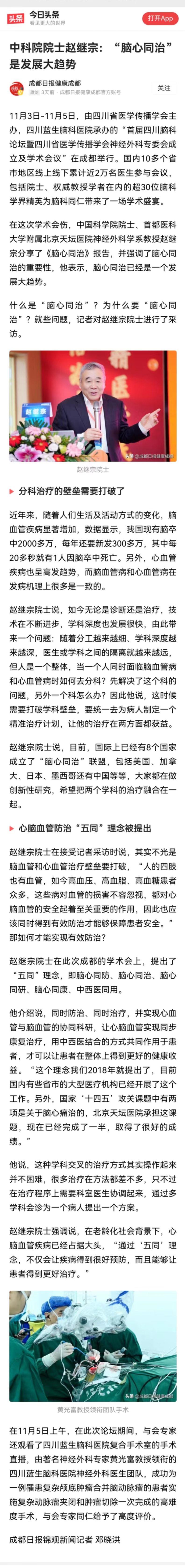今日頭條:中科院院士趙繼宗:“腦心同治”是發展大趨勢