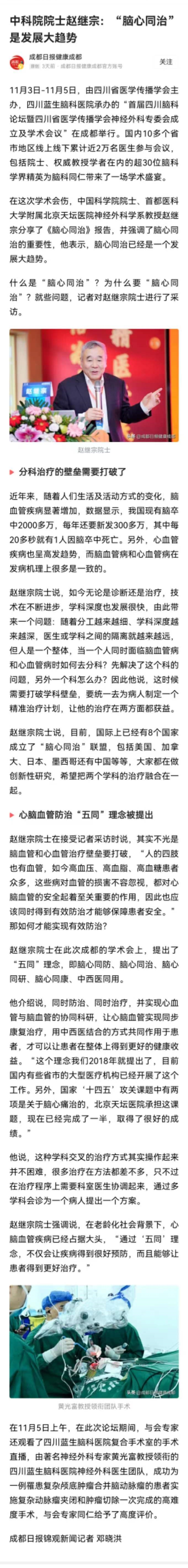 成都日報健康成都:中科院院士趙繼宗:“腦心同治”是發展大趨勢