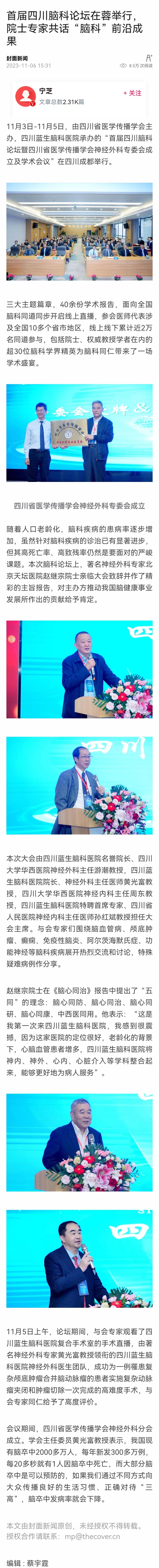11月3日-11月5日,由四川省醫(yī)學(xué)傳播學(xué)會(huì)主辦,四川藍(lán)生腦科醫(yī)院承辦的“首屆四川腦科論壇暨四川省醫(yī)學(xué)傳播學(xué)會(huì)神經(jīng)外科專(zhuān)委會(huì)成立及學(xué)術(shù)會(huì)議”在四川成都舉行。