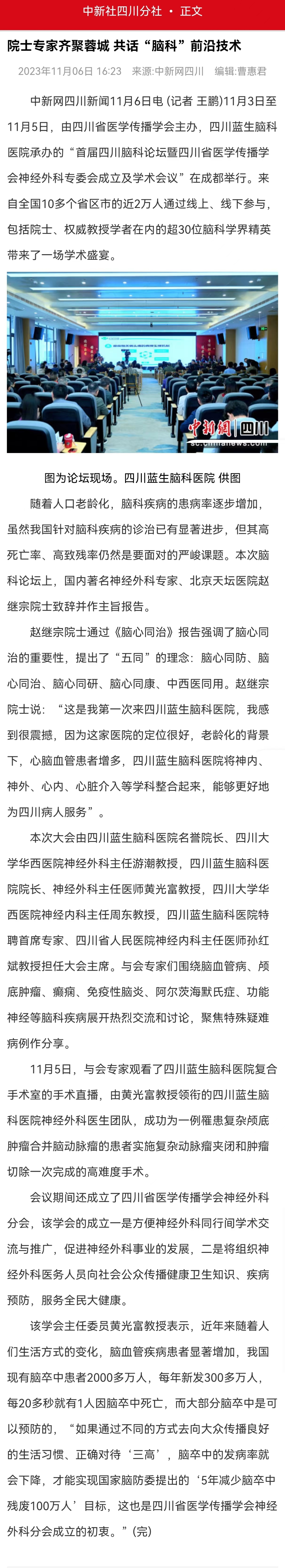 中新網(wǎng)四川新聞11月6日電 (記者 王鵬)11月3日至11月5日,由四川省醫(yī)學(xué)傳播學(xué)會(huì)主辦,四川藍(lán)生腦科醫(yī)院承辦的“首屆四川腦科論壇暨四川省醫(yī)學(xué)傳播學(xué)會(huì)神經(jīng)外科專委會(huì)成立及學(xué)術(shù)會(huì)議”在成都舉行。來自全國(guó)10多個(gè)省區(qū)市的近2萬人通過線上、線下參與,包括院士、權(quán)威教授學(xué)者在內(nèi)的超30位腦科學(xué)界精英帶來了一場(chǎng)學(xué)術(shù)盛宴。