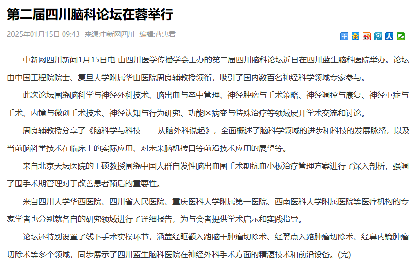 由四川醫(yī)學(xué)傳播學(xué)會主辦的第二屆四川腦科論壇近日在四川藍生腦科醫(yī)院舉辦。論壇由中國工程院院士、復(fù)旦大學(xué)附屬華山醫(yī)院周良輔教授領(lǐng)銜,吸引了國內(nèi)數(shù)百名神經(jīng)科學(xué)領(lǐng)域?qū)<覅⑴c。
