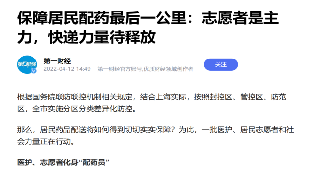第一財經:保障居民配藥最后一公里:志愿者是主力,快遞力量待釋放