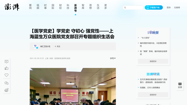 徐匯衛生健康、澎湃網:上海藍生萬眾醫院黨支部召開專題組織生活會