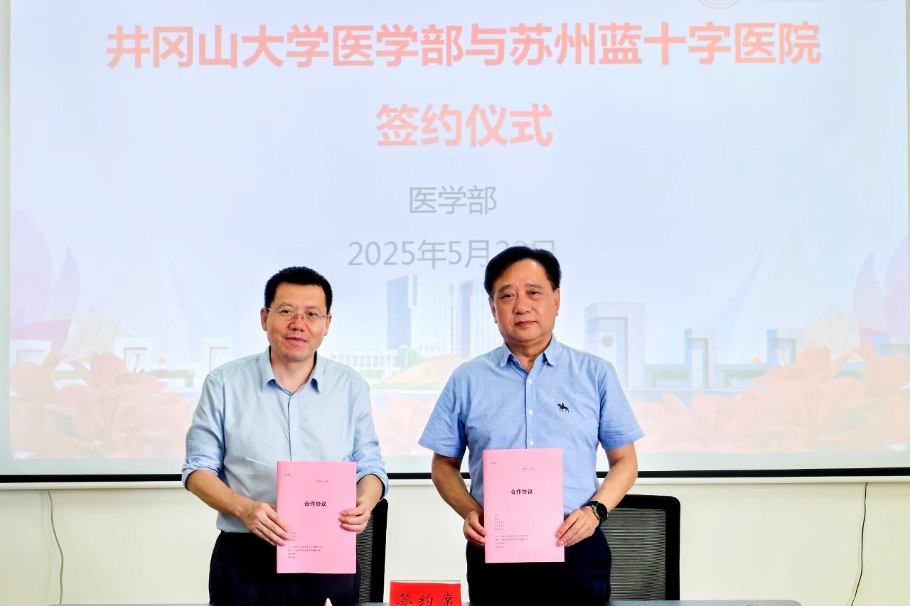 △ 井岡山大學(xué)醫(yī)學(xué)部黨工委副書記康永平(左)與徐必生院長(zhǎng)簽約