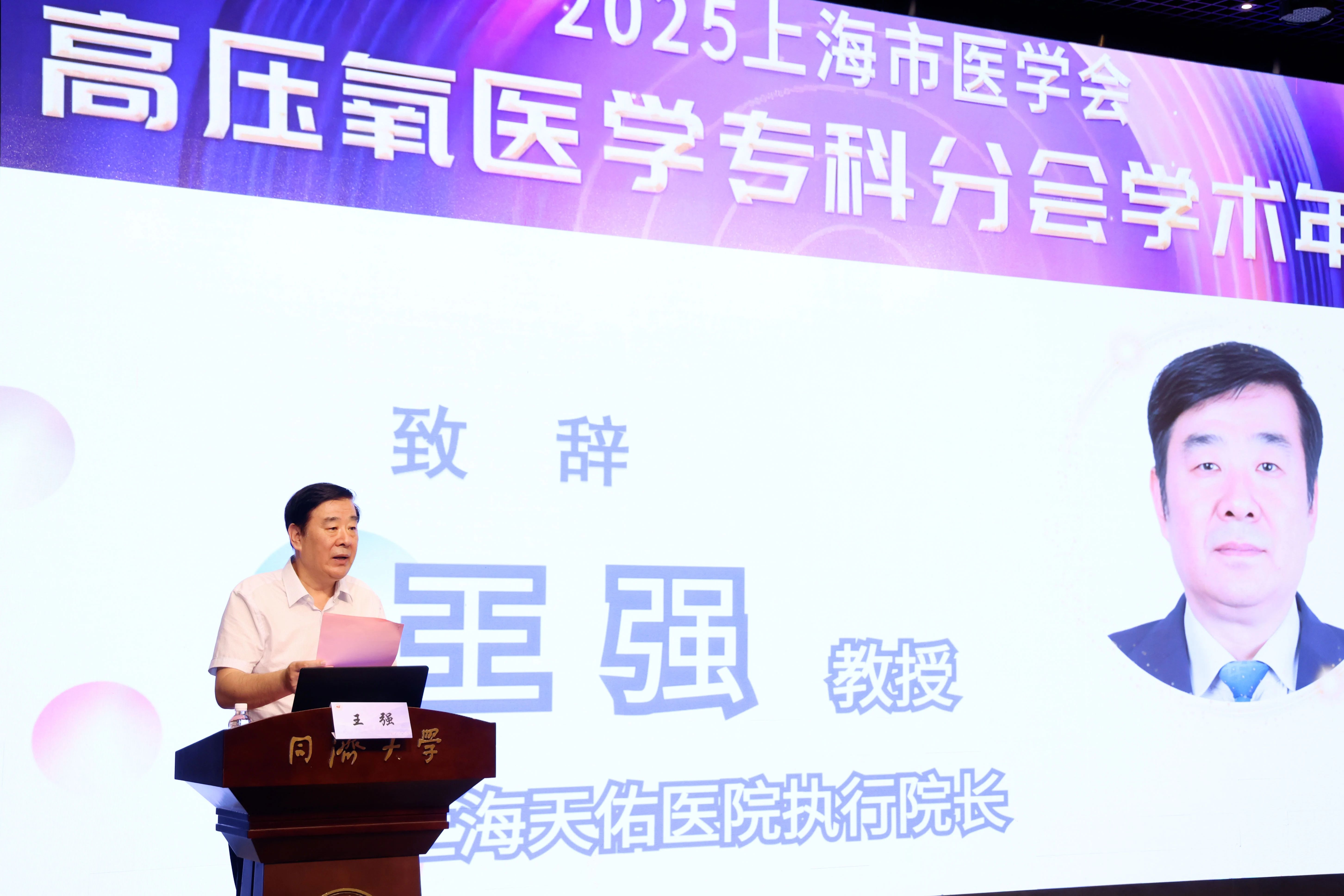 王強執行院長為大會致辭。他介紹,上海天佑醫院一直高度重視高壓氧醫學的進步與發展,建立了由高壓氧治療科、NICU病房、神經內(外)科、心血管內科、呼吸內科、康復醫學科、中醫科等多學科聯合平臺,組建了以劉青樂教授領銜的專業團隊,通過引進大型高端方型艙、創建高規格的腦復蘇病房,為急危重癥患者的搶救、診治和昏迷患者的促醒提供了良好的軟硬件保障。高壓氧危重癥治療專科于2024年被評為上海市專科影響力品牌。天佑醫院發起成立的高壓氧腦復蘇學科聯盟吸引了全國知名公立三甲、二甲醫院加盟,成為享譽全國的高壓氧腦復蘇學科品牌。該聯盟成立以來,通過線上學術交流會、線下授牌授課等活動,不斷加強與成員單位間的溝通交流和技術指導,提升了成員單位危重癥醫學、高壓氧治療和腦復蘇學科水平。