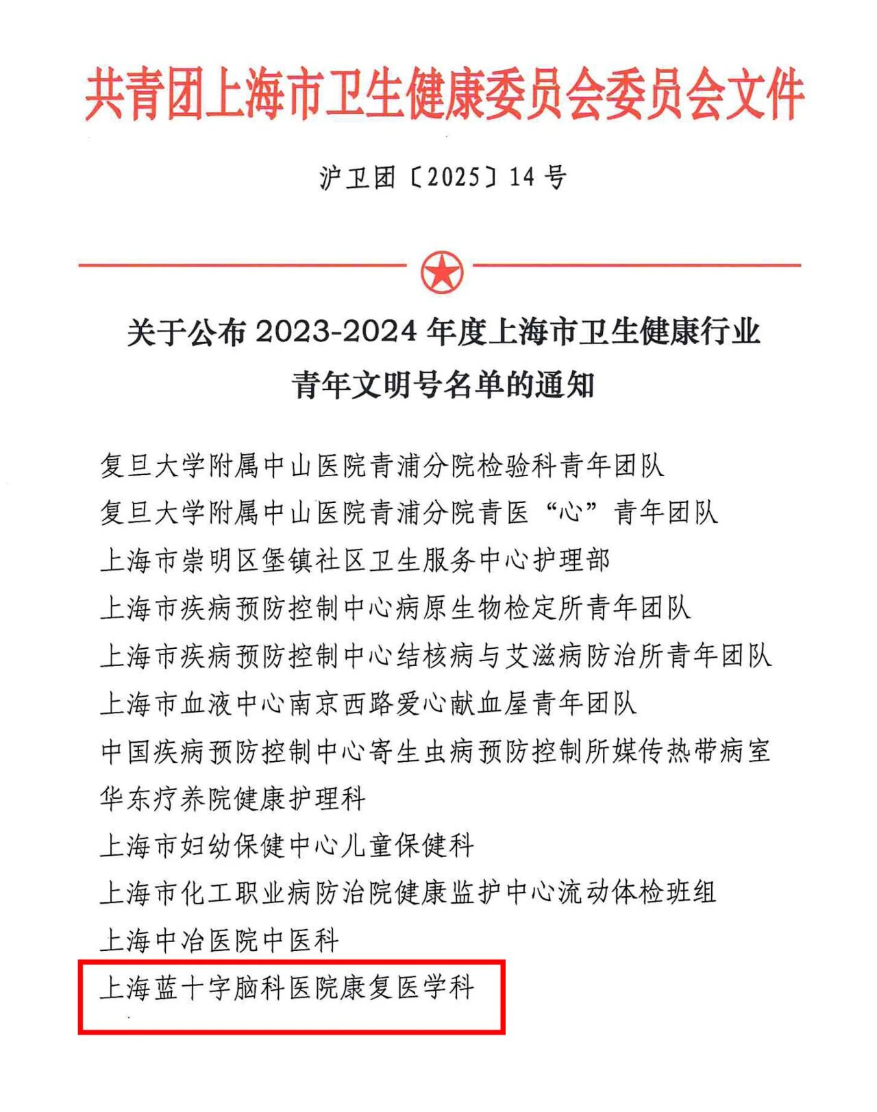 2023年6月,康復醫學科在醫院黨支部的統籌引領與大力推薦下,憑借扎實的專業基礎、積極向上的團隊風貌以及良好的發展潛力,順利通過資格審核,成功入選“2023-2024年度上海市衛生健康行業青年文明號”創建名單。2025年9月成功入選全市80家典型集體之一。
