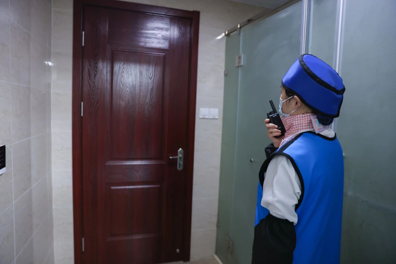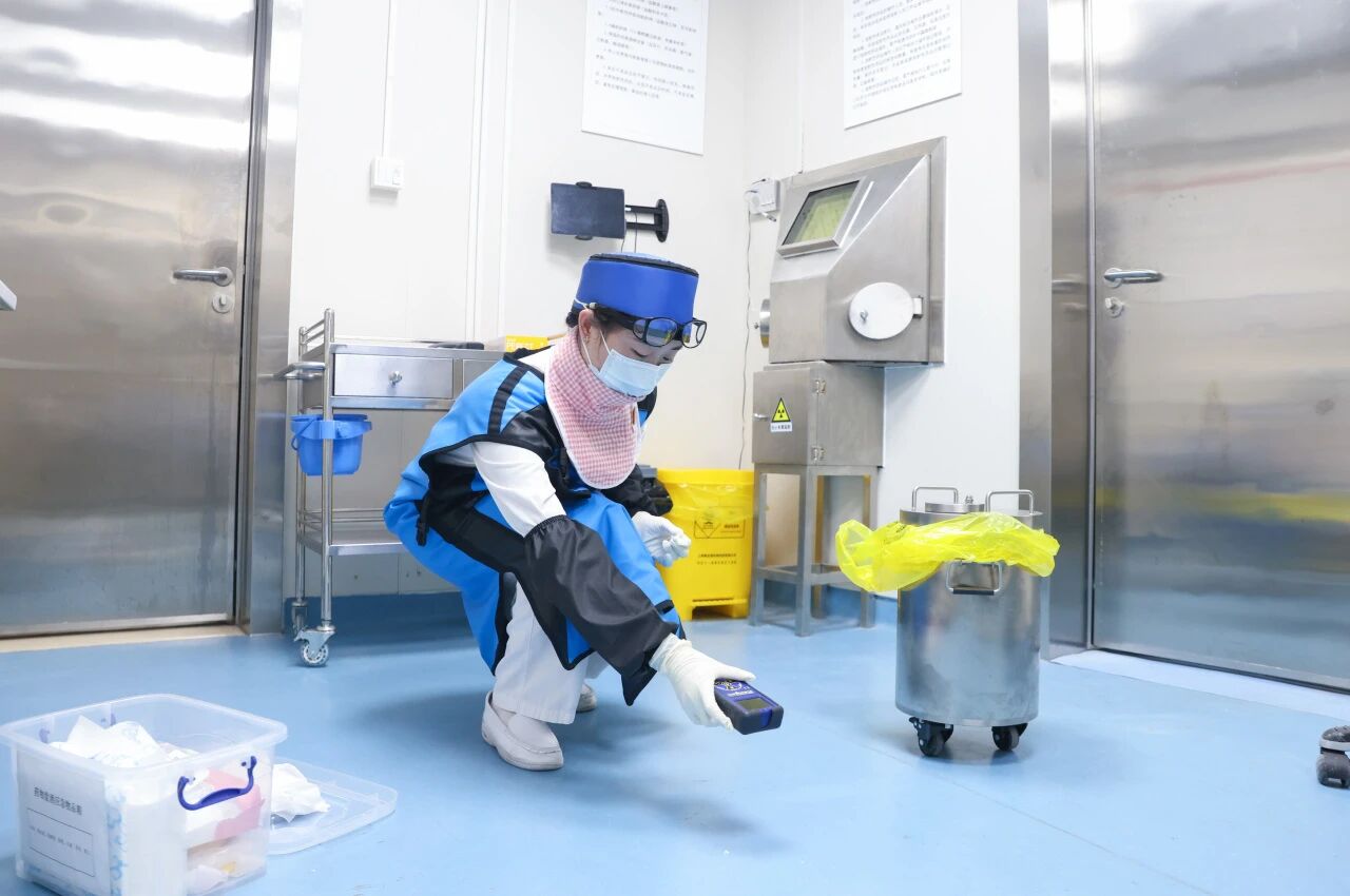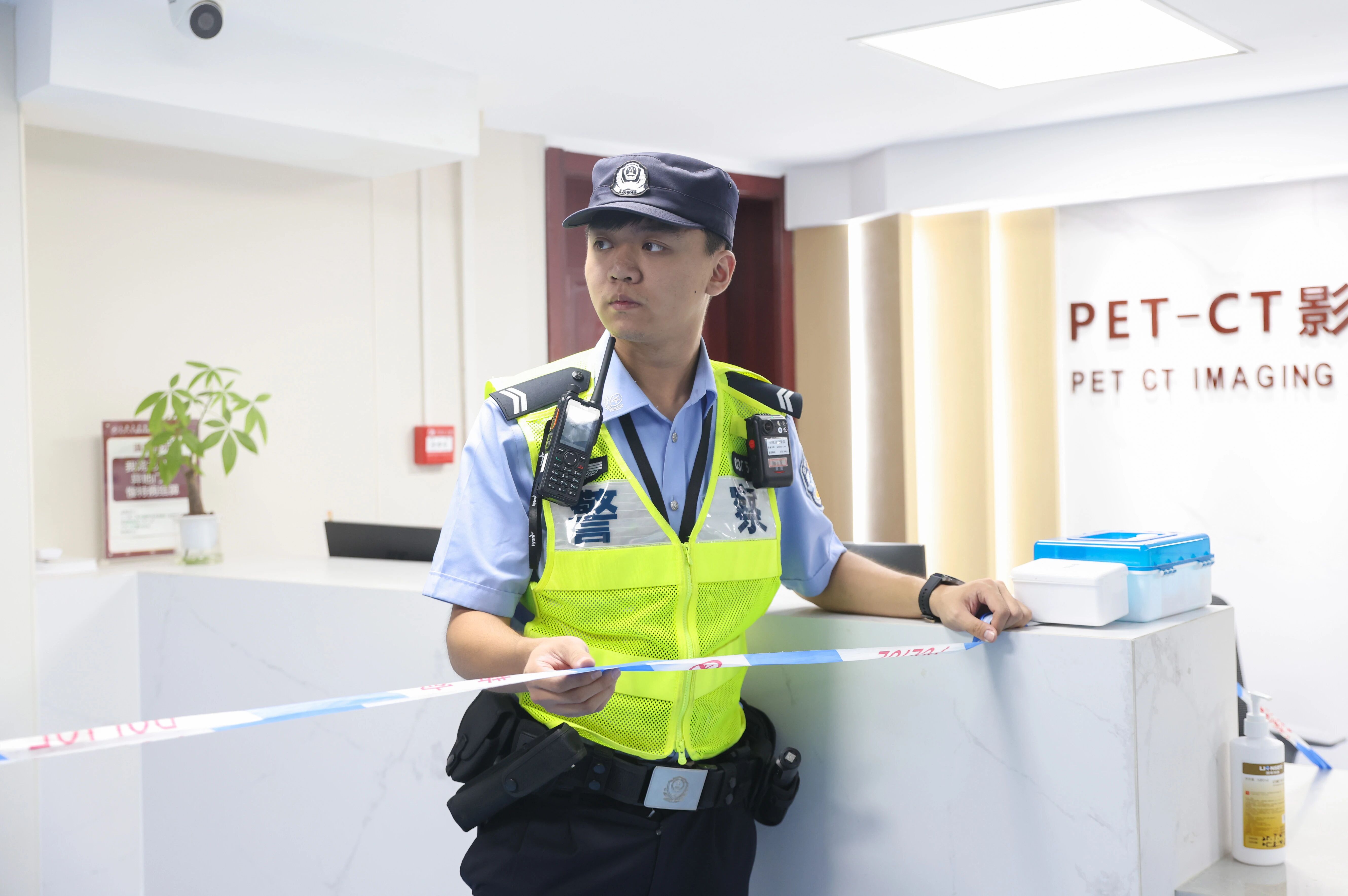 15點15分,普陀區生態環境局、普陀區疾控中心(區衛監所)、普陀區公安分局治安支隊人員同時到場。生態環境局應急處置人員穿戴好防護裝備,手持輻射監測儀,從PET-CT室大門口向內進行輻射監測。