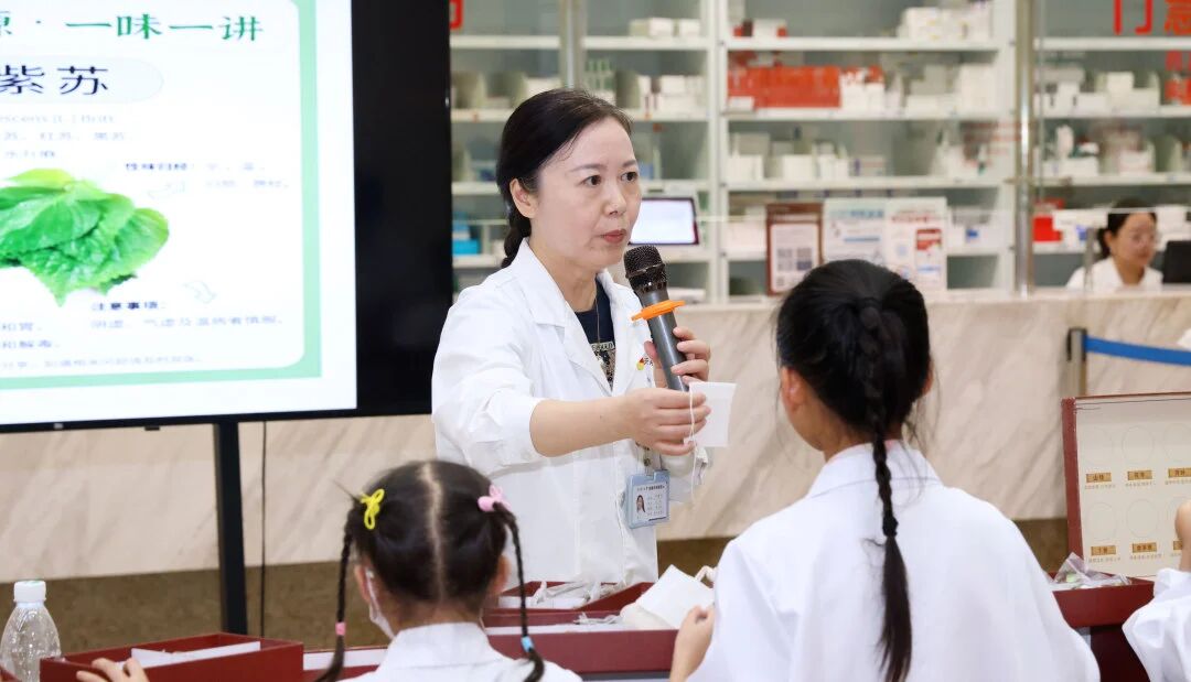 下午2時許,孩子們穿上定制白大褂,在門診大廳興奮合影后,迫不及待地開始了體驗。在中藥房,田韶波藥師早已備好紫蘇葉、陳皮、薄荷、藿香等多種常見藥材,迎接“小中醫”的到來。