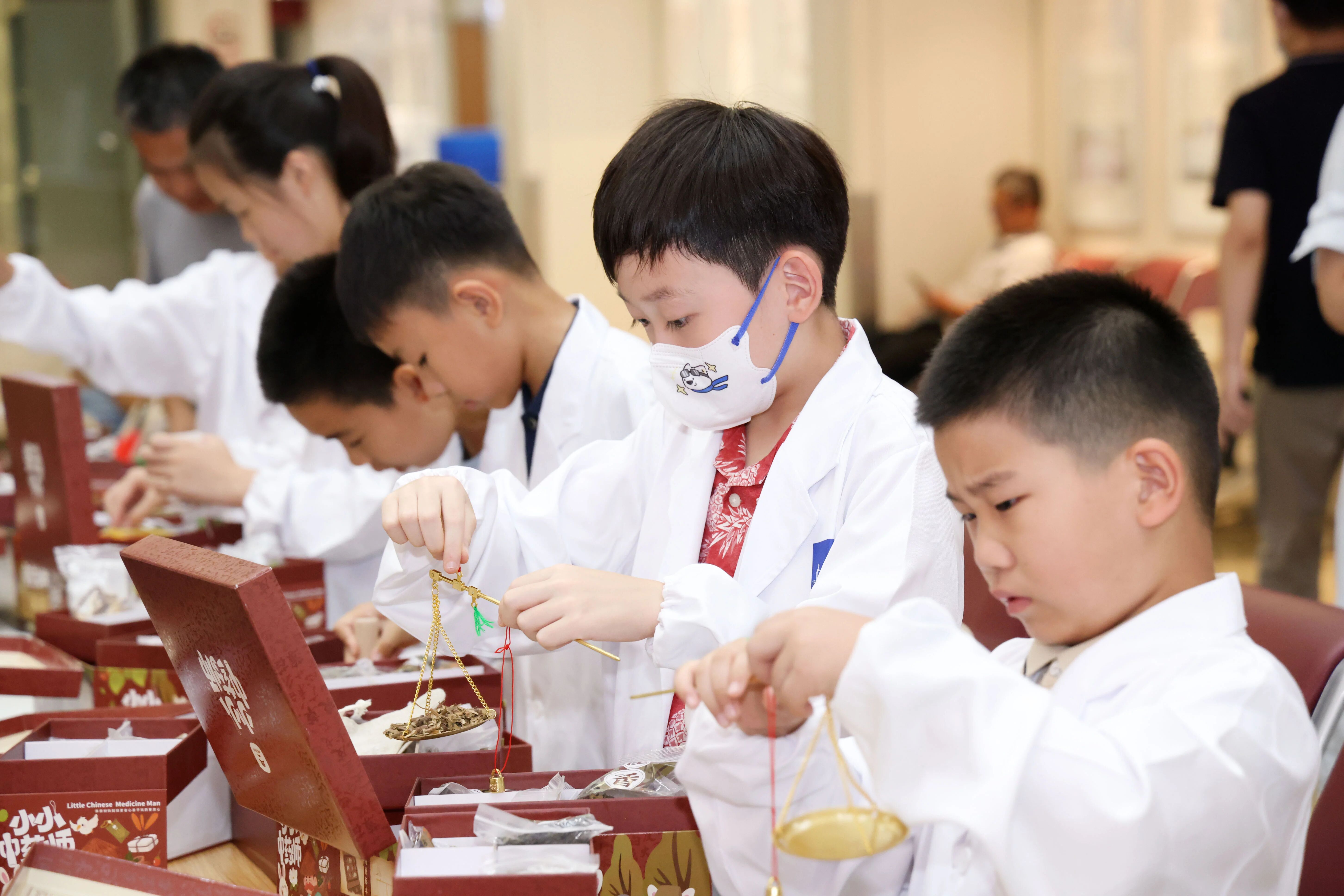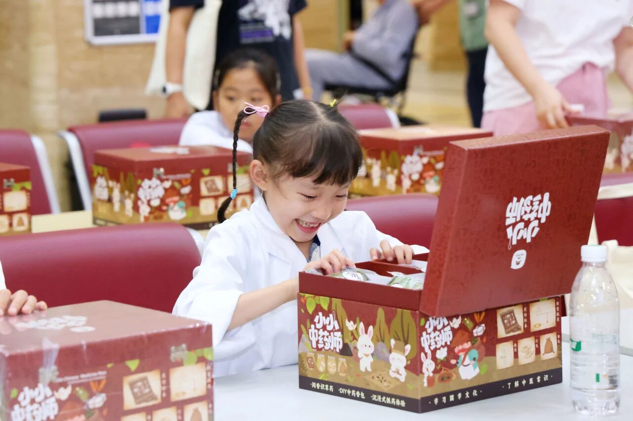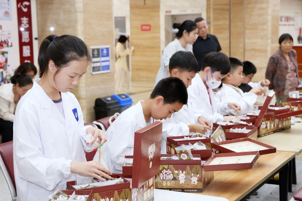 每個孩子的桌前,都整齊擺放著醫院特別準備的“小小中藥師”香囊制作箱。箱內不僅有八種常用藥材原料包,還配有仿古銅桿秤、木質搗藥臼、古風包藥紙和香囊袋,孩子們可以完整體驗傳統中藥材香囊的制作流程,沉浸式體驗中醫文化的博大精深。