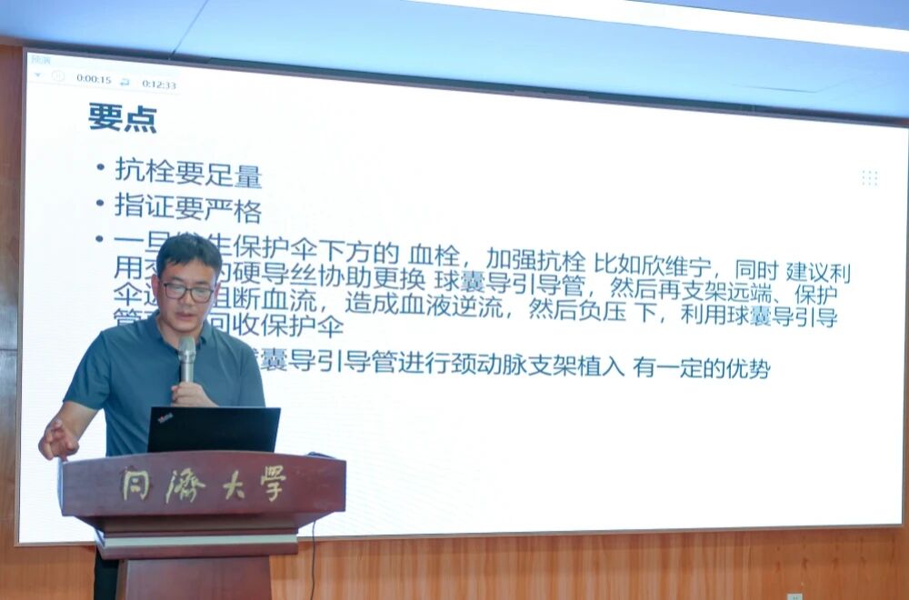 上海交通大學醫(yī)學院附屬第九人民醫(yī)院神內(nèi)科主任劉建仁教授在講述《應對危機:頸動脈支架術中保護傘附近新發(fā)血栓的識別與處理》時,提出采用球囊導引導管對術中發(fā)生的保護傘附近新發(fā)血栓的處理具有顯著優(yōu)勢。術中應確保抗栓藥物足量且指征嚴格。一旦發(fā)生保護傘下方血栓,需在加強抗栓的同時,利用交換的硬導絲更換為球囊導引導管,進而于支架遠端、保護傘近端阻斷血流以制造逆流,最終在負壓狀態(tài)下直接回收保護傘等。