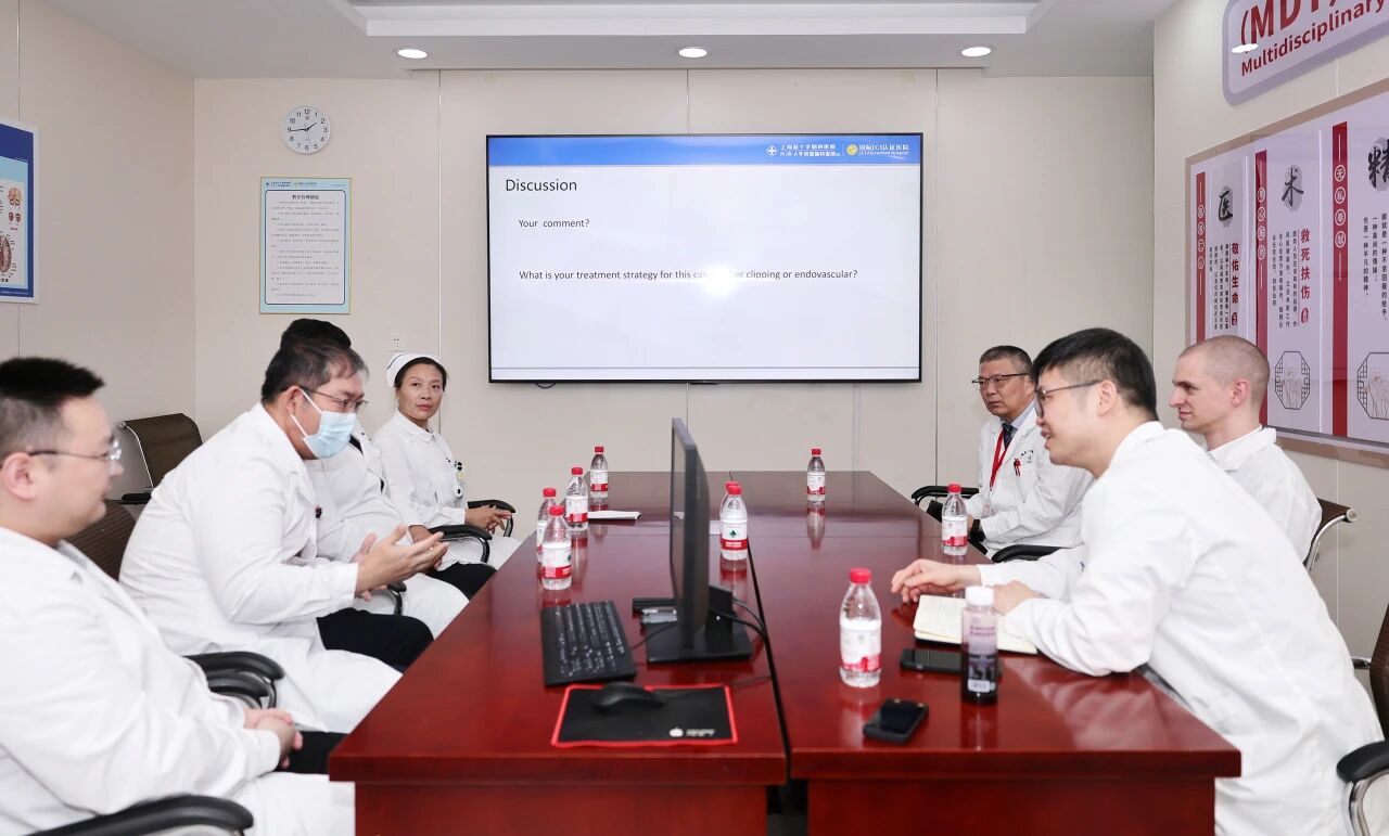 在周克祥副院長(zhǎng)陪同下,David Satzer博士與6B神經(jīng)外二科盧云鶴博士團(tuán)隊(duì)開(kāi)展病例討論。盧云鶴博士以流利英文主持,雙方就大腦中動(dòng)脈分叉部動(dòng)脈瘤的治療策略進(jìn)行交流。David Satzer博士介紹了美國(guó)基于指南的外科手術(shù)主流方式,并對(duì)上海藍(lán)十字腦科醫(yī)院開(kāi)展的血流導(dǎo)向裝置、WEB擾流裝置等介入技術(shù)表示肯定。此外,雙方還就腦轉(zhuǎn)移瘤綜合治療、強(qiáng)迫癥外科手術(shù)的倫理法律差異等議題展開(kāi)探討。盧云鶴博士重點(diǎn)介紹了醫(yī)院在腦機(jī)接口領(lǐng)域的臨床應(yīng)用,特別是對(duì)昏迷患者進(jìn)行意識(shí)評(píng)估及脊髓電刺激促醒的實(shí)踐成果,引起David Satzer博士濃厚興趣。雙方討論持續(xù)兩個(gè)半小時(shí),意猶未盡,并互換聯(lián)系方式,期待在學(xué)科建設(shè)與科研合作方面持續(xù)推進(jìn)。