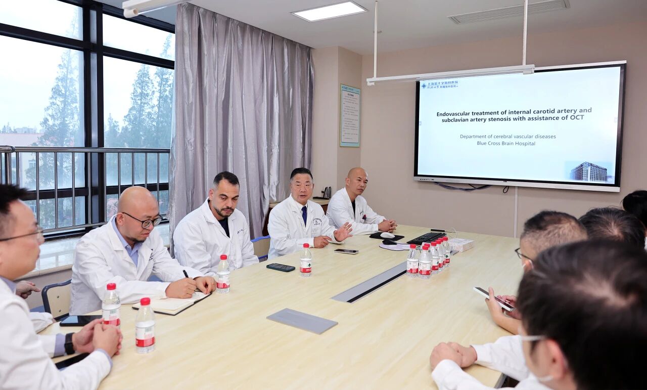 Tareq Kass-Hout副教授在潘耀良副院長(zhǎng)陪同下,深入4F腦血管病科,圍繞一例復(fù)雜的“頸內(nèi)動(dòng)脈合并鎖骨下動(dòng)脈狹窄”病例,與科室團(tuán)隊(duì)進(jìn)行了深入討論。雙方重點(diǎn)探討了OCT(光學(xué)相干斷層成像)這一前沿血管內(nèi)影像技術(shù)在術(shù)前評(píng)估、術(shù)中支架選型與放置、以及術(shù)后效果評(píng)價(jià)中的關(guān)鍵作用。Tareq Kass-Hout副教授對(duì)上海藍(lán)十字腦科醫(yī)院能夠熟練運(yùn)用OCT技術(shù)處理復(fù)雜病變表示贊賞,并結(jié)合該病例與與席剛明教授、王貴平博士團(tuán)隊(duì)就抗血小板治療策略調(diào)整、栓塞保護(hù)方案優(yōu)化、不同介入路徑(如橈動(dòng)脈)的器械選擇等臨床難點(diǎn)展開(kāi)交流。這場(chǎng)基于真實(shí)病例的深度對(duì)話,超越技術(shù)展示層面,直擊臨床決策核心,充分體現(xiàn)雙方合作的務(wù)實(shí)與高效,也為未來(lái)在腦血管介入領(lǐng)域的聯(lián)合研究與技術(shù)提升開(kāi)辟了新路徑。