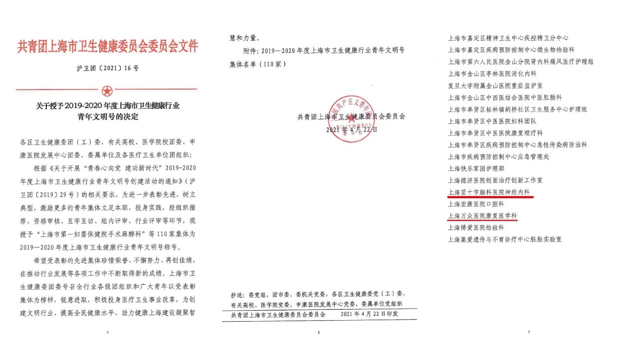 近日,共青團(tuán)上海衛(wèi)生健康委員會(huì)委員會(huì)下發(fā)《關(guān)于授予2019-2020年度上海市衛(wèi)生健康行業(yè)青年文明號(hào)的決定》,上海藍(lán)十字腦科醫(yī)院神經(jīng)內(nèi)科和上海藍(lán)生萬眾醫(yī)院康復(fù)醫(yī)學(xué)科被授予“2019-2020年度上海市衛(wèi)生健康行業(yè)青年文明號(hào)”榮譽(yù)稱號(hào)。