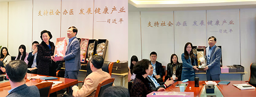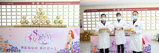 上海藍(lán)生萬眾醫(yī)院黨支部書記、總經(jīng)理徐筱林,院長韓建新為女性員工送上美好祝愿和精美禮物。