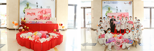 上海康沈醫(yī)院院長沈廣智、總經(jīng)理卓海輝為女性員工送上鮮花和誠摯問候。