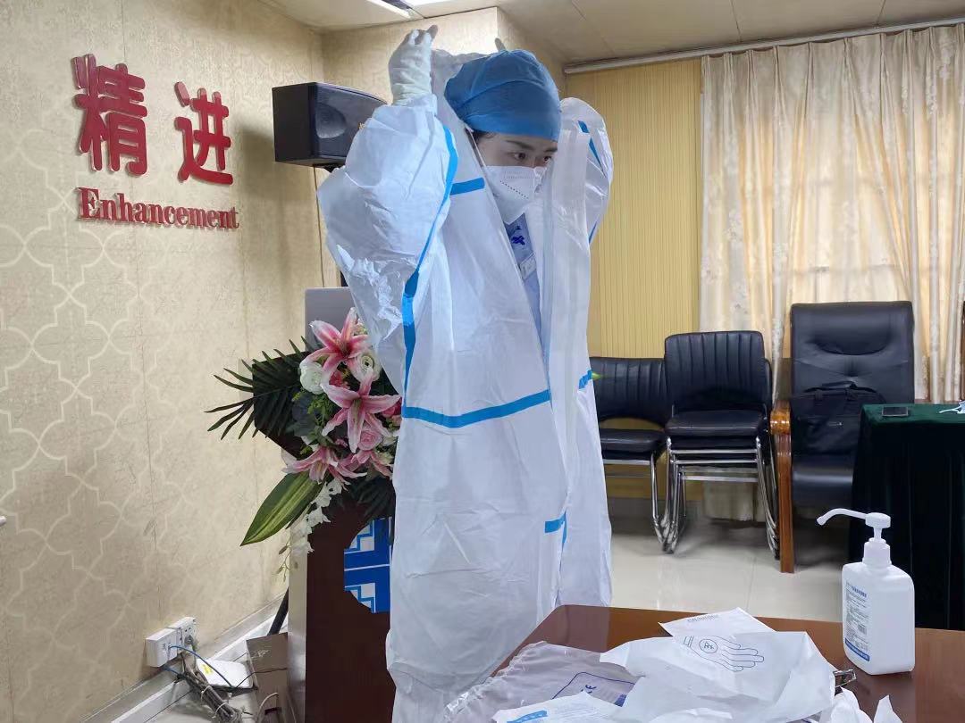 四病區(qū)護(hù)士長于如如現(xiàn)場指導(dǎo)示范穿戴防護(hù)服和消毒隔離的正確操作,通過結(jié)合視頻課件和實(shí)操培訓(xùn),隊(duì)員們逐一通過考核并完成采樣崗前防控培訓(xùn)。