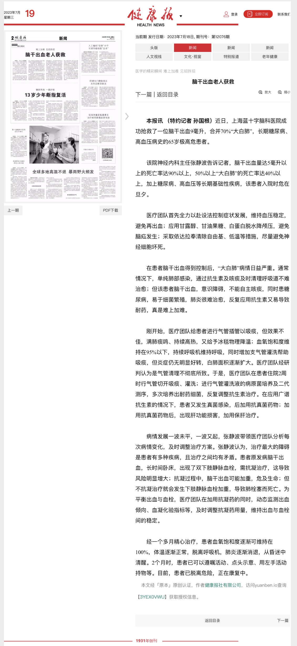 近日,上海藍十字腦科醫院成功搶救了一位腦干出血9毫升,合并70%“大白肺”長期糖尿病、高血壓病史的65歲極高危患者。