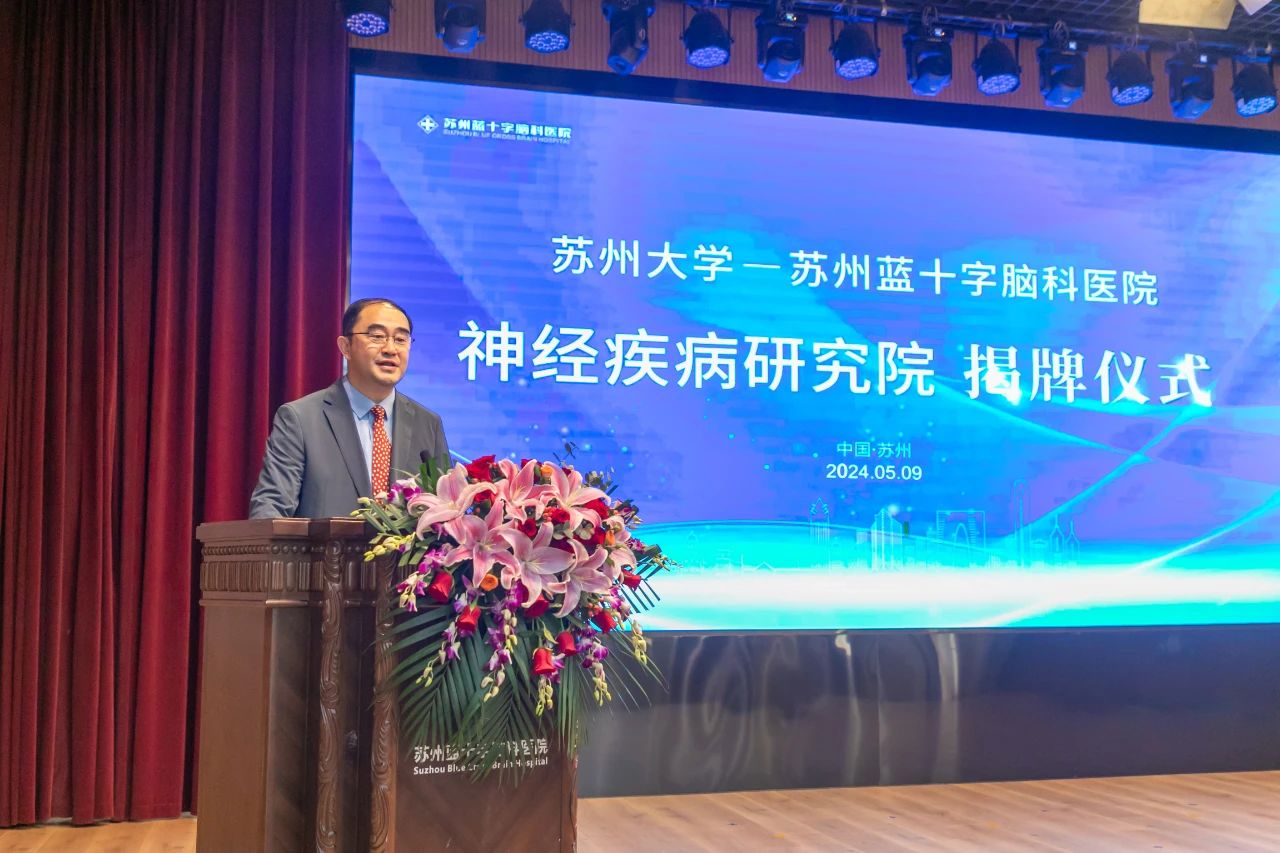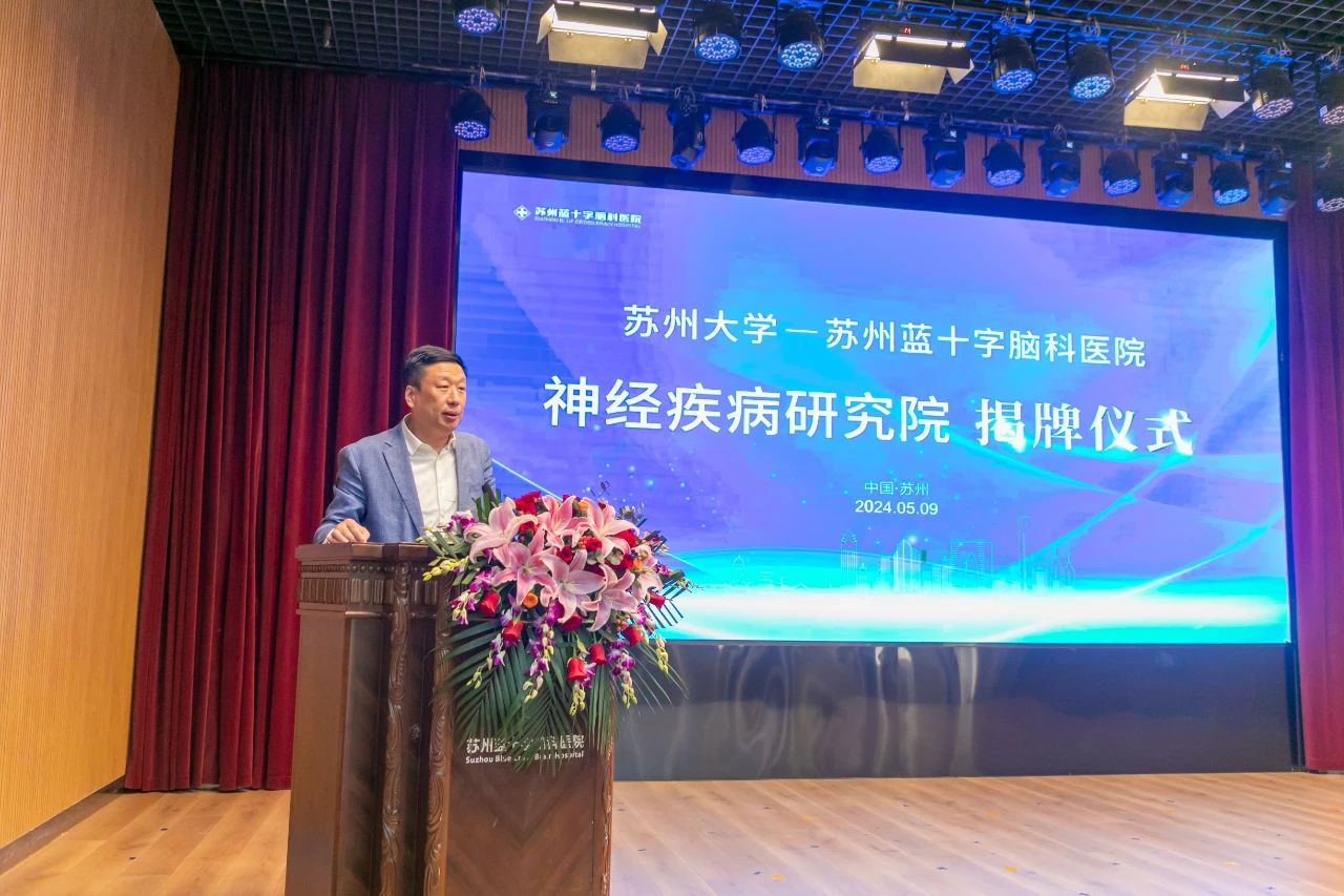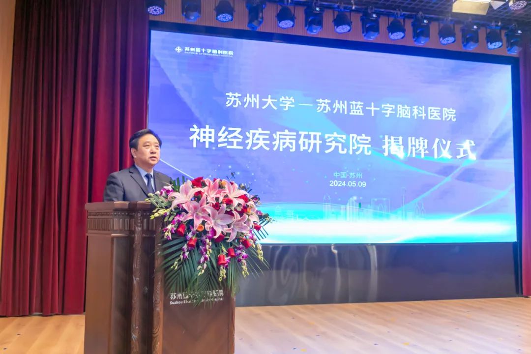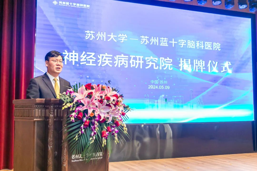 2024年5月9日上午,惠風和暢,蓓蕾初放,蘇州大學-蘇州藍十字腦科醫院神經疾病研究院揭牌儀式于蘇州藍十字腦科醫院舉行。蘇州大學科技黨委書記徐小樂、蘇州市相城區衛健委主任孫偉為、蘇州大學神經科學研究所副所長劉耀波、公司總經理劉軼永、蘇州藍十字腦科醫院院長徐必生出席儀式并致辭。