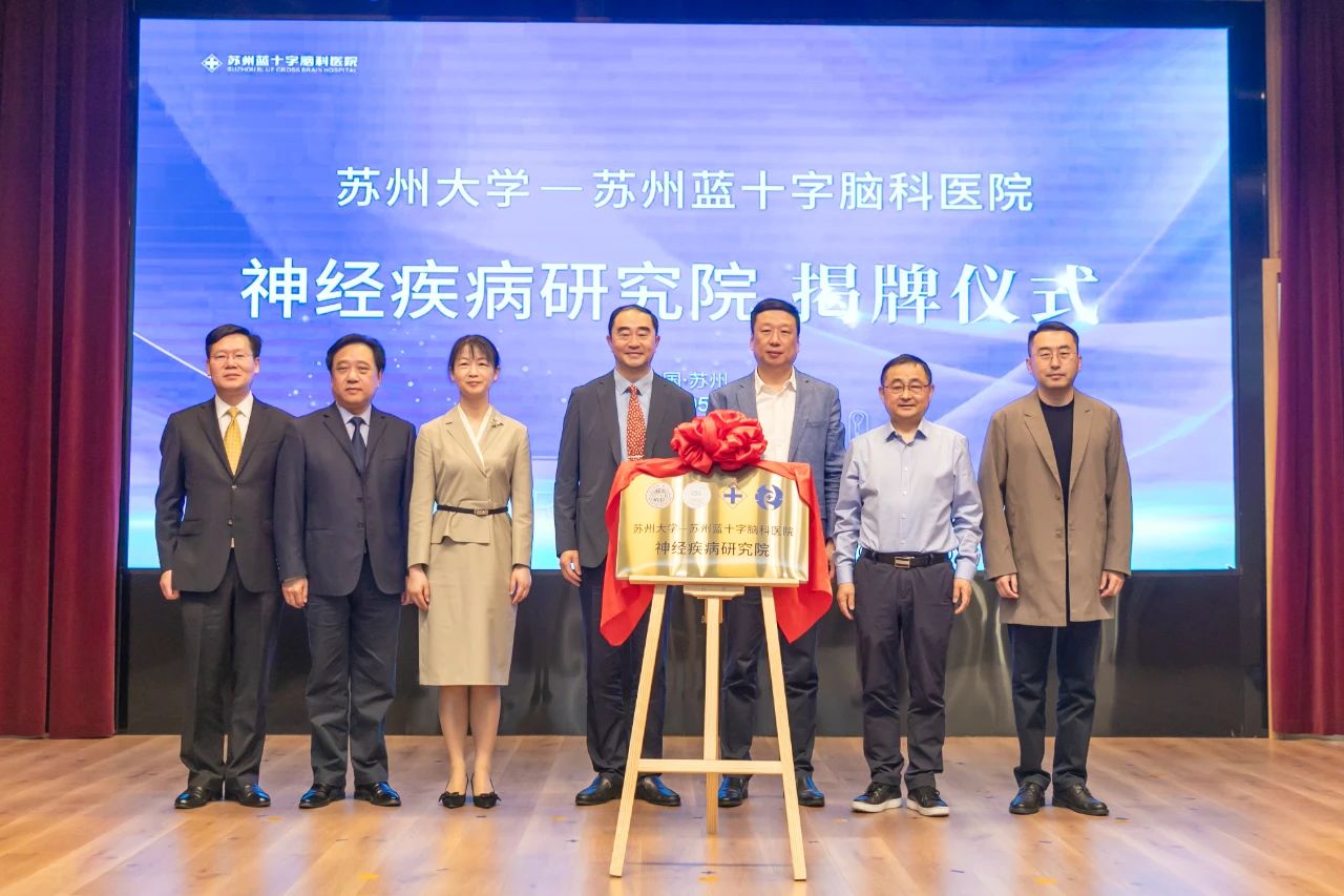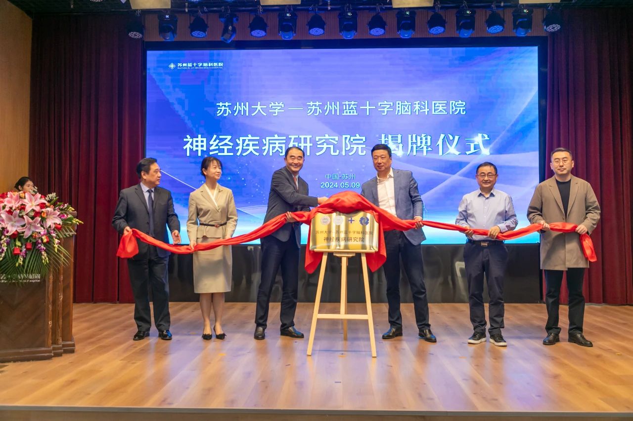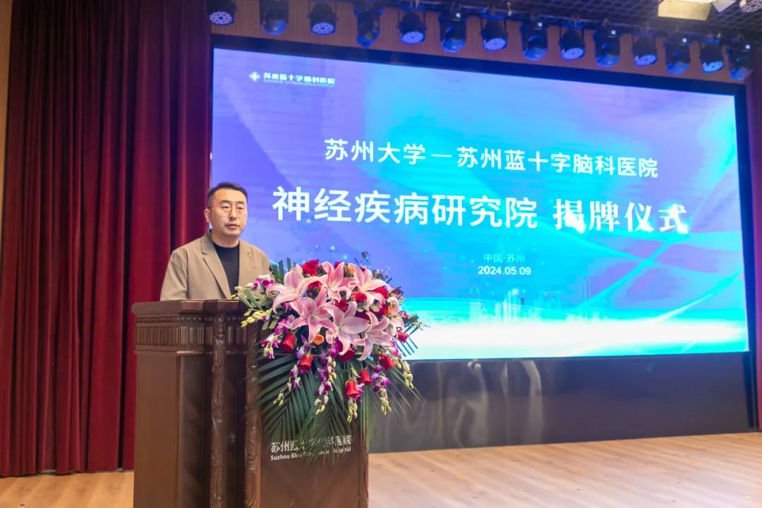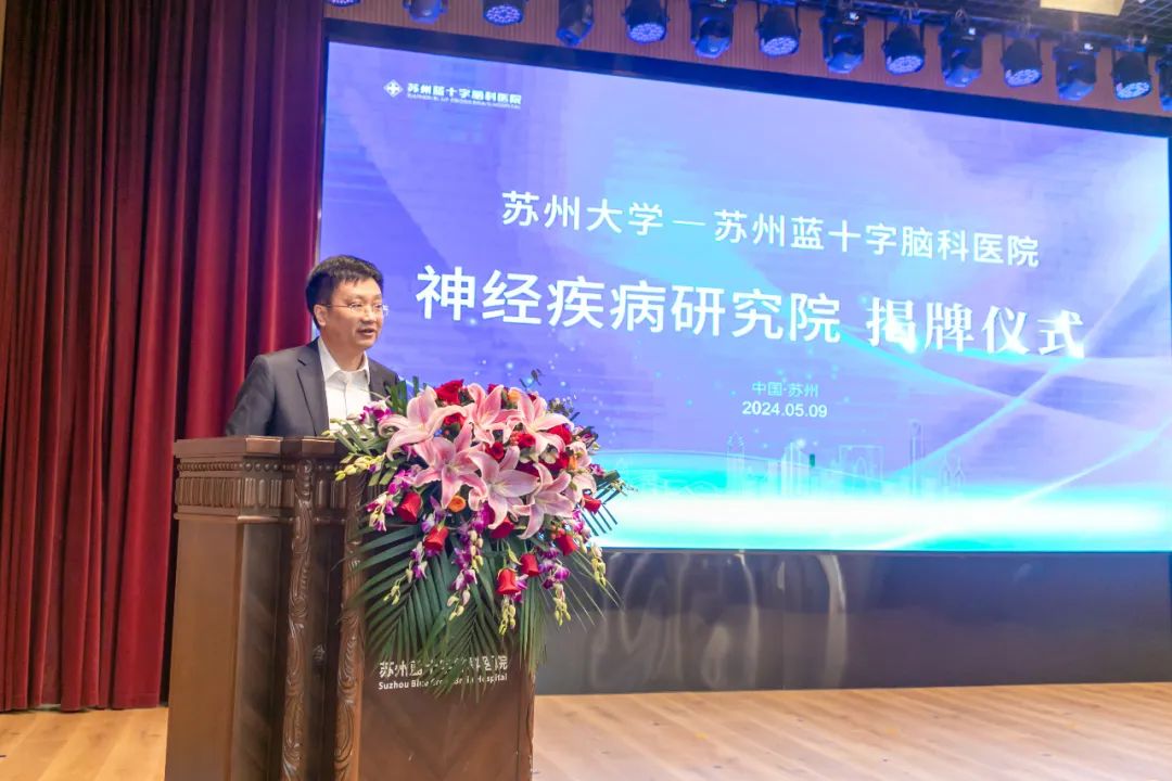 2024年5月9日上午,惠風和暢,蓓蕾初放,蘇州大學-蘇州藍十字腦科醫院神經疾病研究院揭牌儀式于蘇州藍十字腦科醫院舉行。蘇州大學科技黨委書記徐小樂、蘇州市相城區衛健委主任孫偉為、蘇州大學神經科學研究所副所長劉耀波、公司總經理劉軼永、蘇州藍十字腦科醫院院長徐必生出席儀式并致辭。