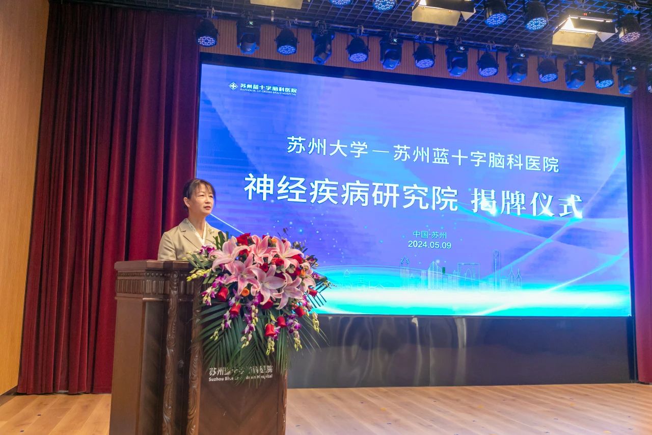 蘇州市相城區衛健委主任孫偉為發表致辭。她表示,“蘇州大學-蘇州藍十字腦科醫院神經疾病研究院”成功揭牌,彌補了相城區腦科學和腦醫學領域教學、科研、臨床有機結合的空白,為全區醫療衛生事業發展注入了新的活力,為全區人民增添了健康福祉。同時,她對開辟“高校-區域”更大范圍、更高層次、更寬領域的協同發展提出了新的愿景。