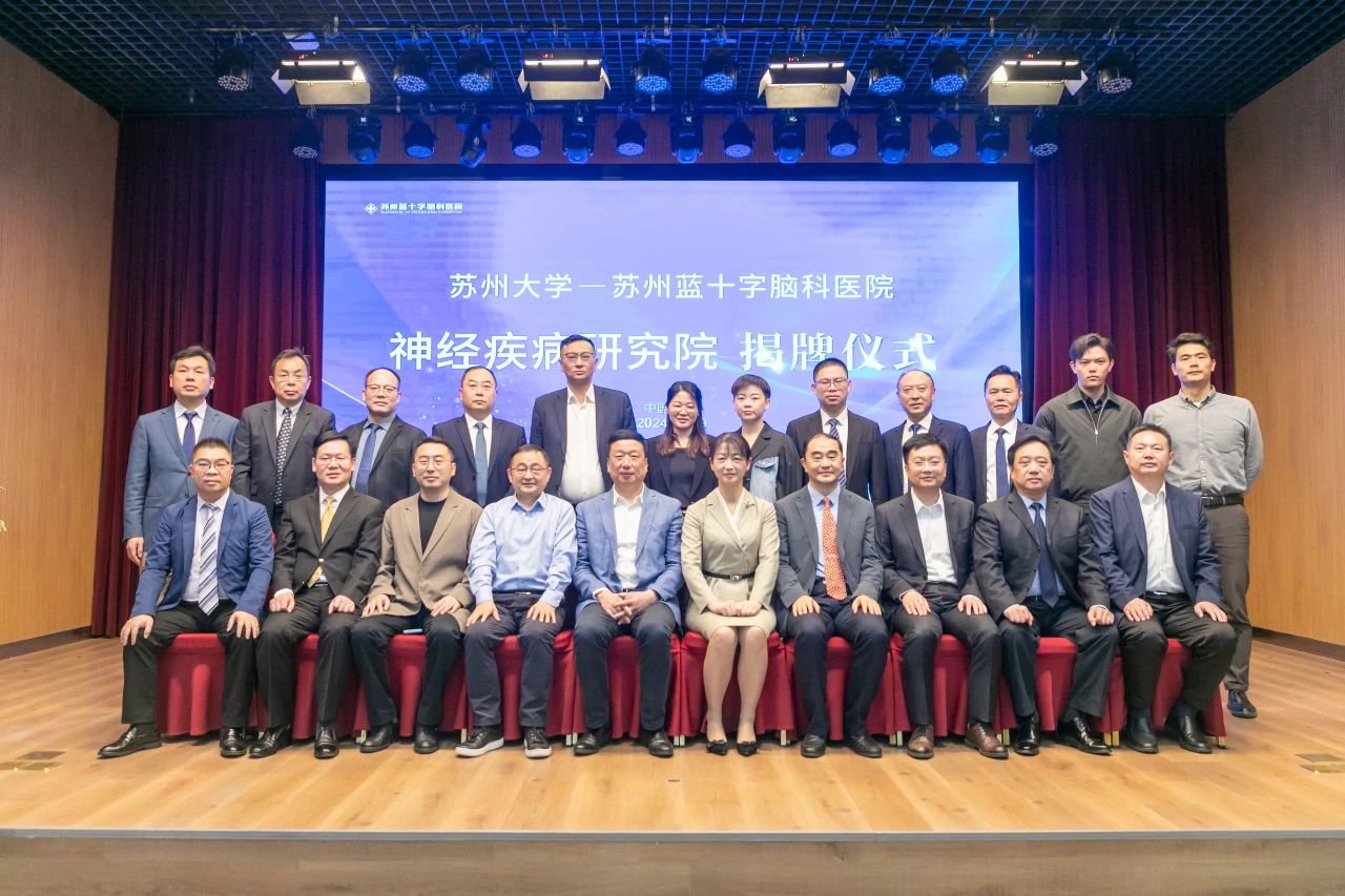 蘇州大學產業技術研究院副院長田天、蘇州大學神經科學研究所所長劉春風、辦公室主任李君、上海藍生腦科研究院執行院長殷作明、上海藍生腦科研究院副院長戴輝、蘇州藍十字腦科醫院總經理劉金爐等出席儀式。儀式由公司副總裁兼黨支部書記陳樹林主持。