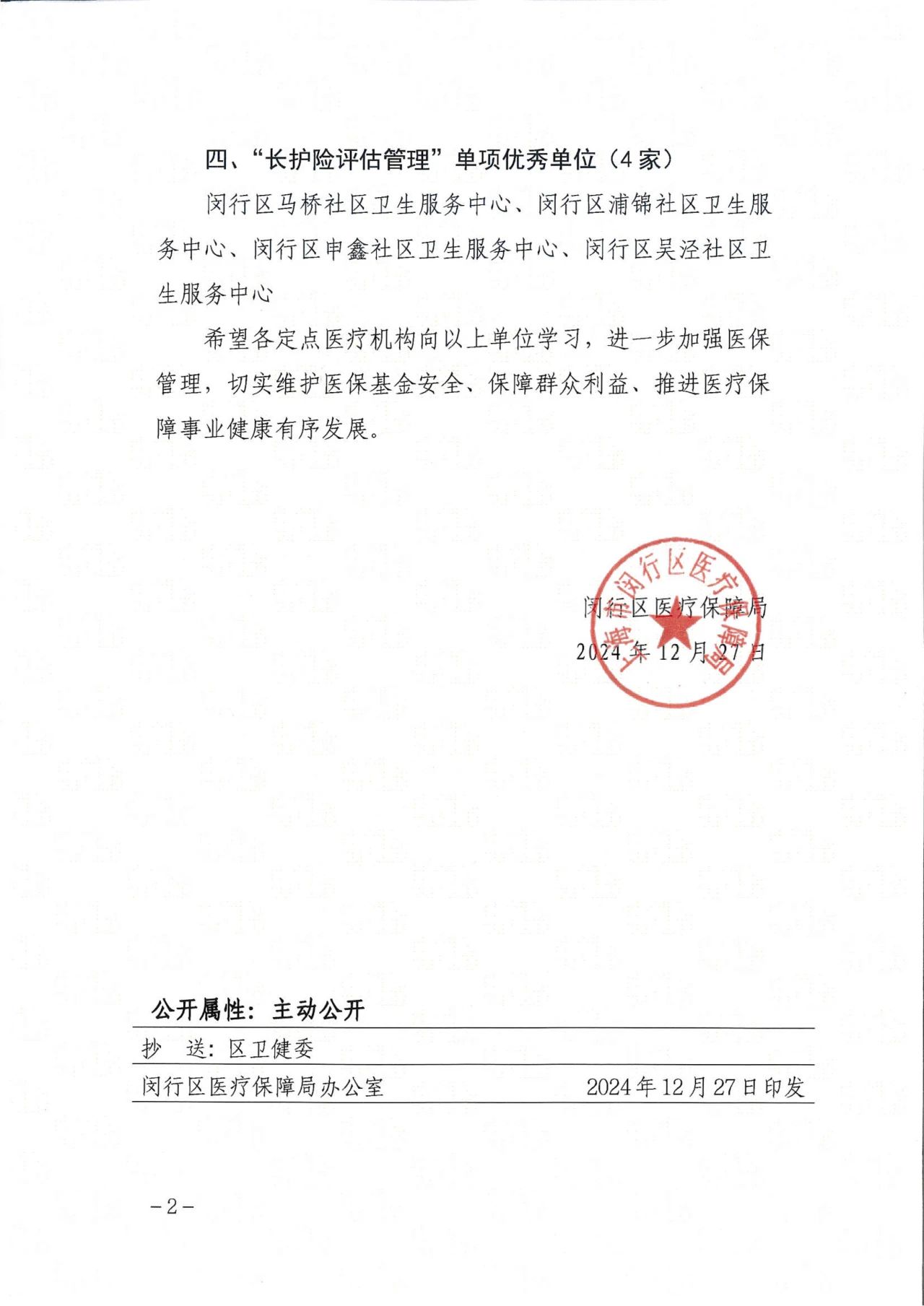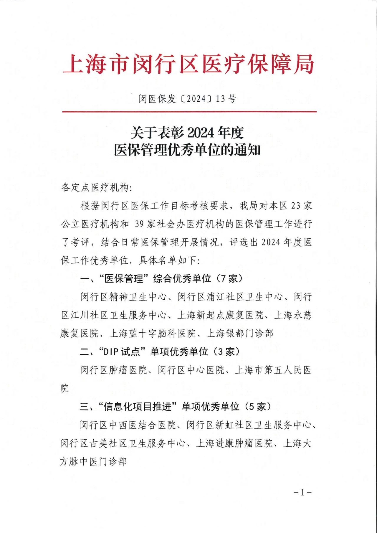 12月27日,上海市閔行區醫療保障局對2024年度醫保管理優秀單位予以通報表彰。據閔行區醫療保障局《關于表彰 2024年度醫保管理優秀單位的通知》(閔醫保發【2024】13號),區醫保局根據醫保工作目標考核要求,對閔行區23家公立醫療機構和39家社會辦醫療機構的醫保管理工作進行了考評,結合日常醫保管理開展情況,最終評選出2024年度醫保工作優秀單位。經考評,上海藍十字腦科醫院與閔行區精神衛生中心等7家單位,獲評“醫保管理”綜合優秀單位榮譽稱號。