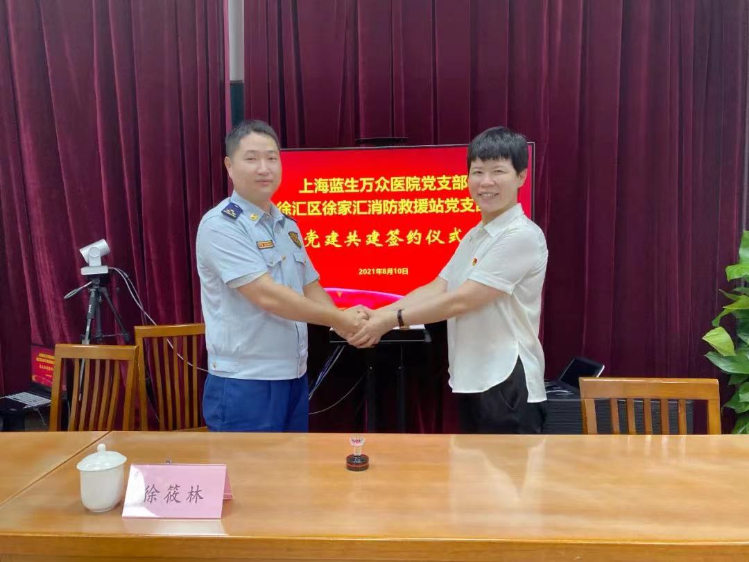 為充分發揮黨建引領作用,通過組織共建、黨員聯動、活動聯辦、資源聯用等方式為黨組織建設開辟新陣地與新載體,提升人民生命安全保障水平,8月10日下午,上海藍生萬眾醫院黨支部與徐家匯消防救援站黨支部舉行黨建共建簽約儀式。