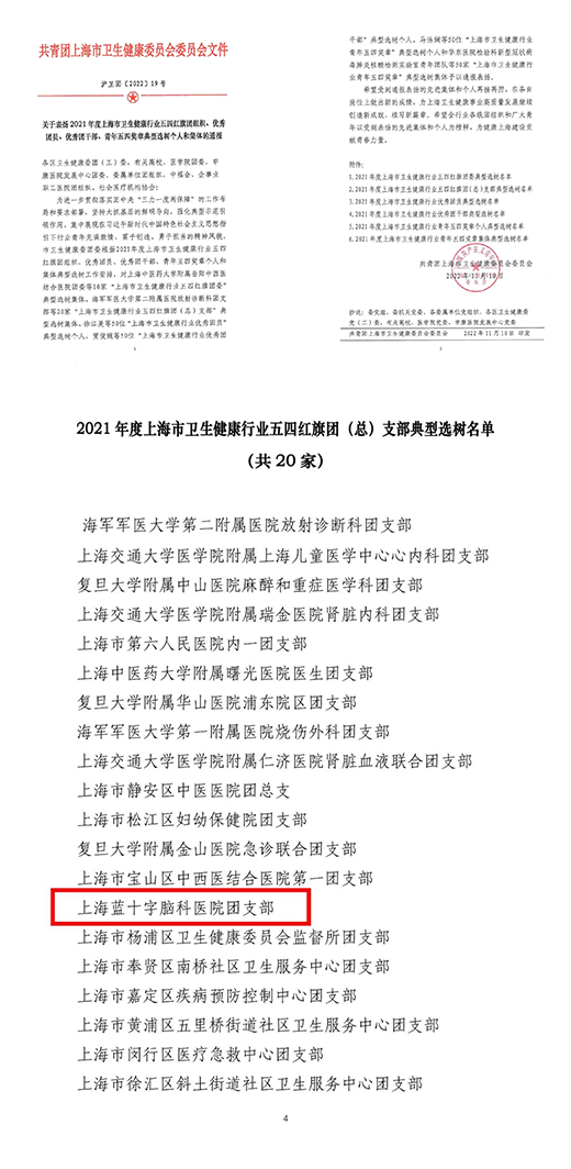11月10日,上海市衛生健康委團委通報表揚2021年度上海市衛生健康行業五四紅旗團組織、優秀團員、優秀團干部、青年五四獎章典型選樹個人和集體。上海藍十字腦科醫院團支部獲評2021年度上海市衛生健康行業五四紅旗團(總)支部典型選樹集體。