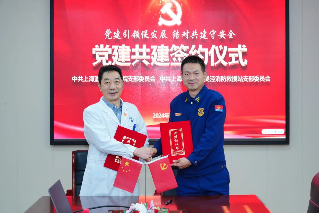 3月29日下午,上海藍生宏德醫院和吳涇消防救援站在行政樓會議室舉行黨建共建簽約儀式。醫院黨支部書記、院長周宏宇,消防救援站黨支部書記、政治指導員張明濤及雙方單位領導、相關科室人員出席。