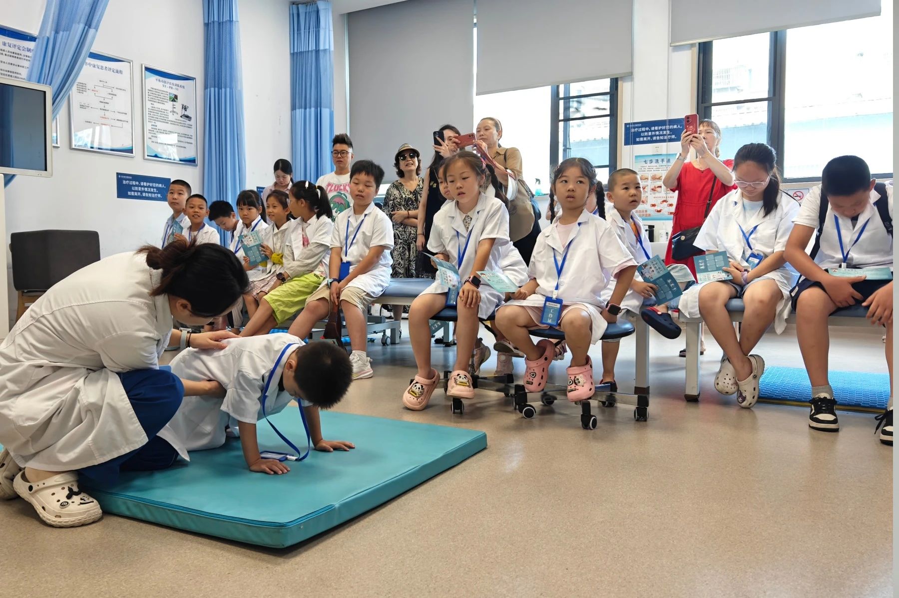 科室探索環(huán)節(jié)就像一場精彩的闖關(guān)游戲,讓孩子們在玩中學(xué),深入了解醫(yī)學(xué)知識。在康復(fù)大廳,孩子們好奇地打量著這里的一切。王玉荷老師生動講解了康復(fù)病人的治療過程,并通過兒童肌骨骼健康互動問答,讓孩子們在輕松交流中加深對康復(fù)醫(yī)學(xué)的理解,對醫(yī)生的敬佩之情悄然萌發(fā)。