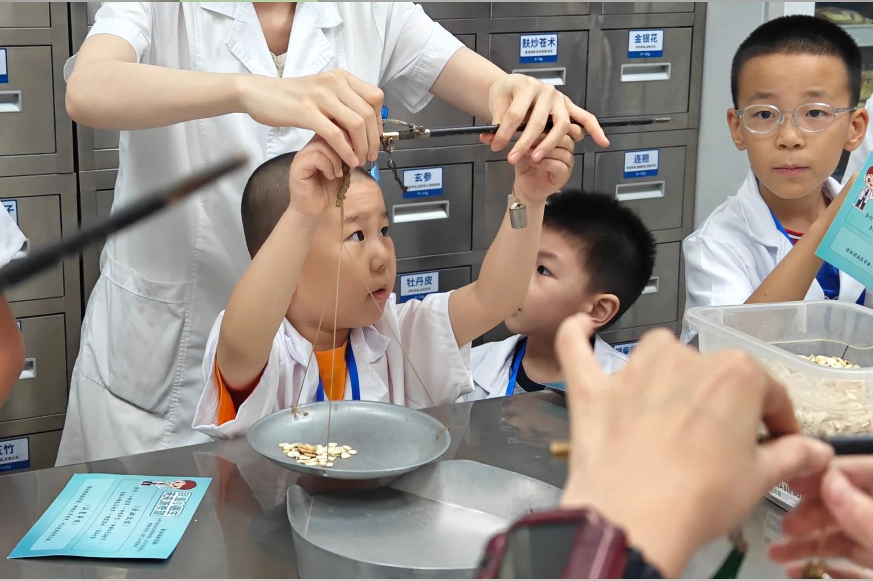 中藥房里,“中藥連連看” 和稱重體驗讓孩子們興致高漲。杜松柏老師先引導(dǎo)大家認(rèn)識各類中藥,通過 “連連看” 游戲?qū)⑺幉呐c功效對應(yīng),既考驗觀察力又鍛煉記憶力。隨后,兩名小朋友自告奮勇體驗藥材稱重,專注的神情贏得了在場所有人的掌聲。